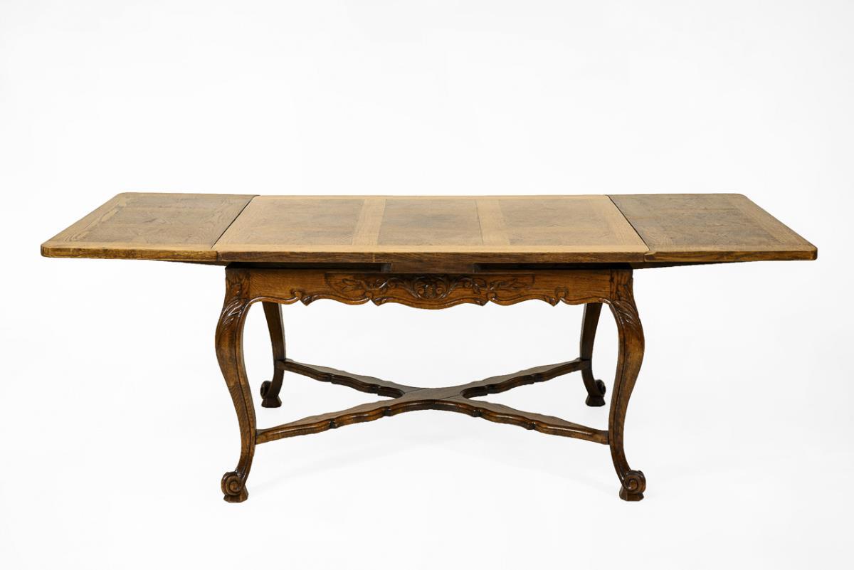 Rechteckiger Speisetisch auf 4 geschwungenen Beinen mit Fußverstrebung, dekoriert mit geschweifter, reliefverzierter Zarge; einseitig oder zweiseitig seitlich ausziehbare Platten. Wohnfertig restauriert.