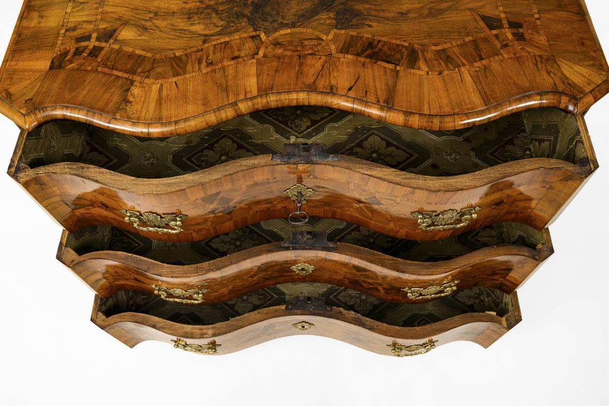 3-schübige Kommode mit geschweiftem Korpus, auf geschwungener Sockelzarge, dekoriert mit gespiegeltem Maserfurnier und Bandlwerkmarketerie, verziert mit Schwanenhals-Messinggriffen und Grotesken-Beschlägen. Alters-/Gebrauchsspuren, restauriert mit Ergänzungen.