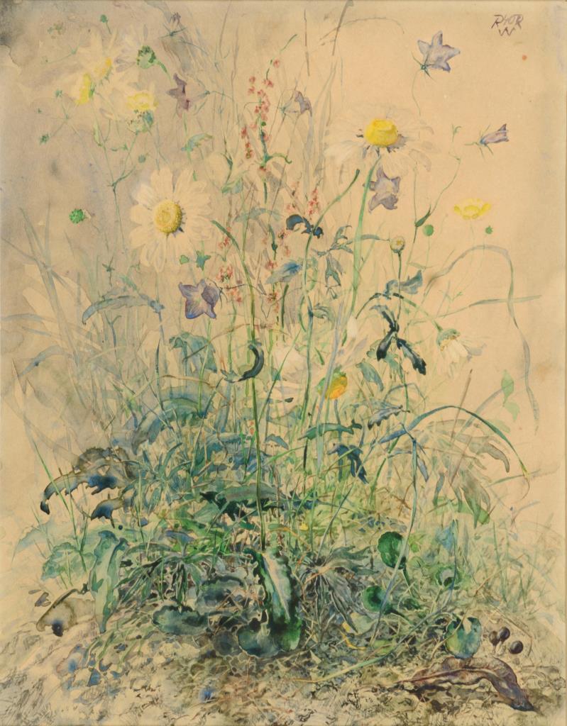 Stimmungsvolles Wiesenstück mit verschiedenen Blumen im hellen Licht.