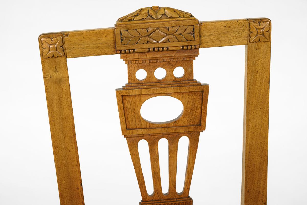 2 gepolsterte Lehnstühle in klassizistischer Formensprache, auf Pfeilerbeinen, Zarge mit Mäander-Schnitzdekor, durchbrochen gearbeitete Lehne mit Urnendekor, sandfarbener Samtbezug. Restauriert, Polster und Bezug ergänzt.