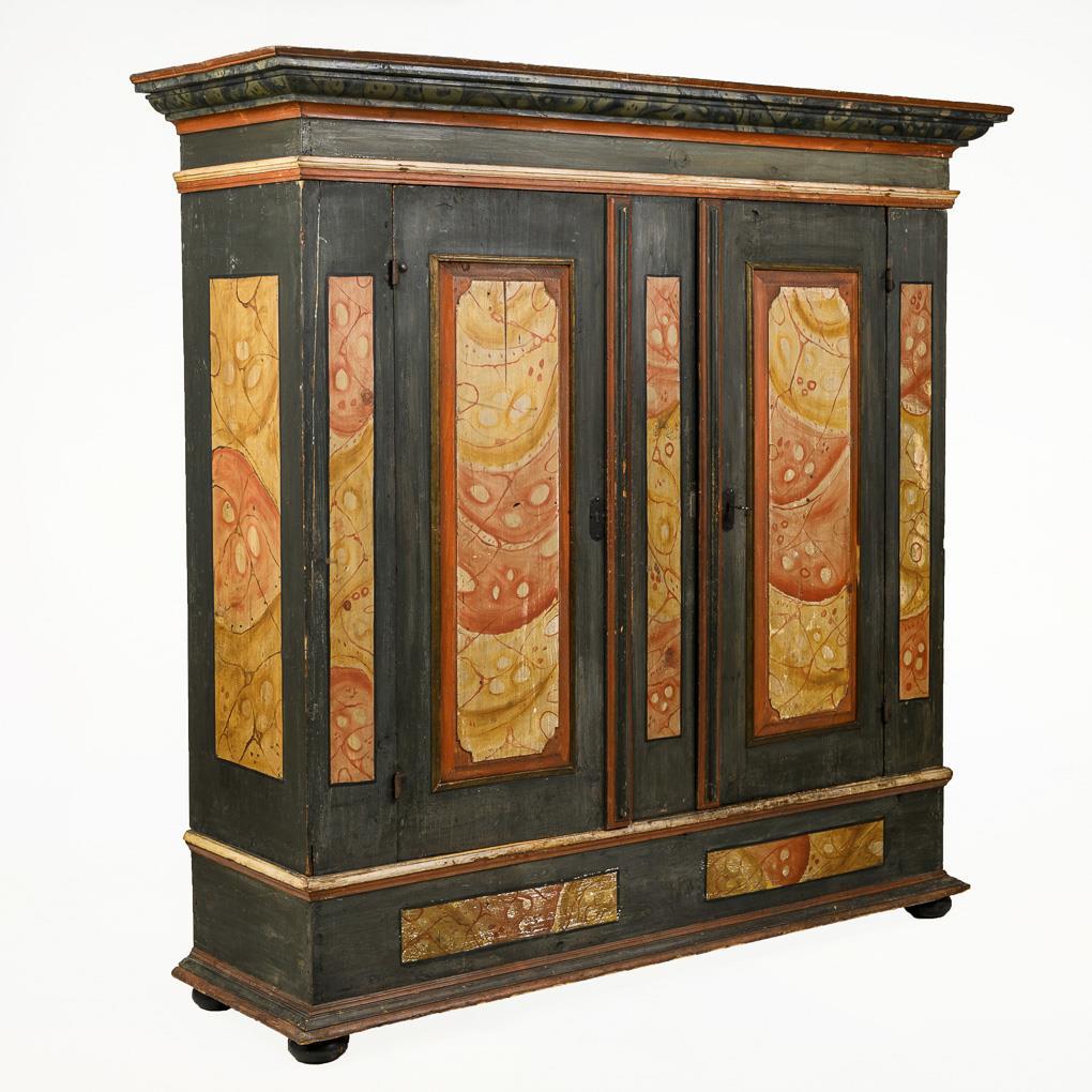 2-türiger Dielenschrank in Brettbauweise, überwiegend blau gefasst, dekoriert mit kassettierten Felder in rötlich-gelber Marmorbemalung; innen etliche Haken und 2 Sockelfächer (davon 1 abschließbar). Alters-/Gebrauchsspuren.
