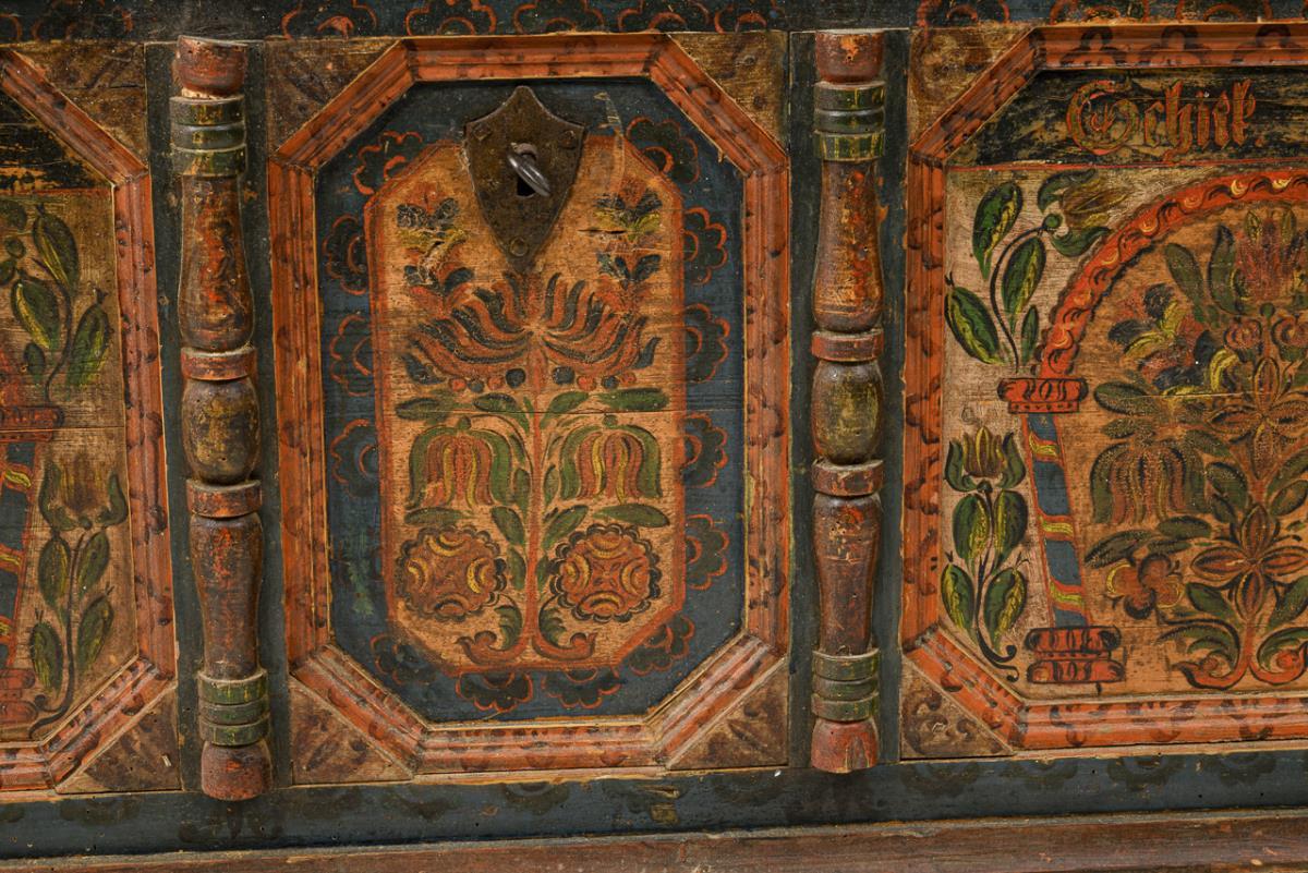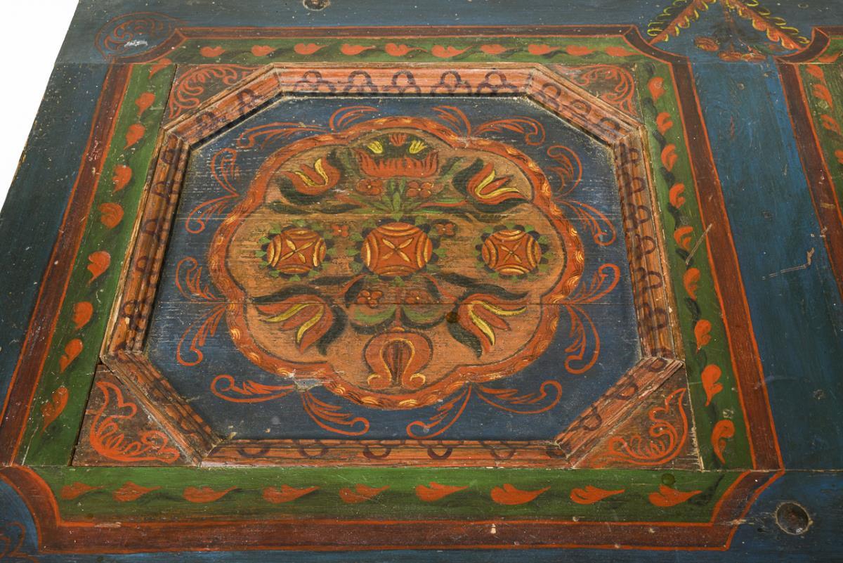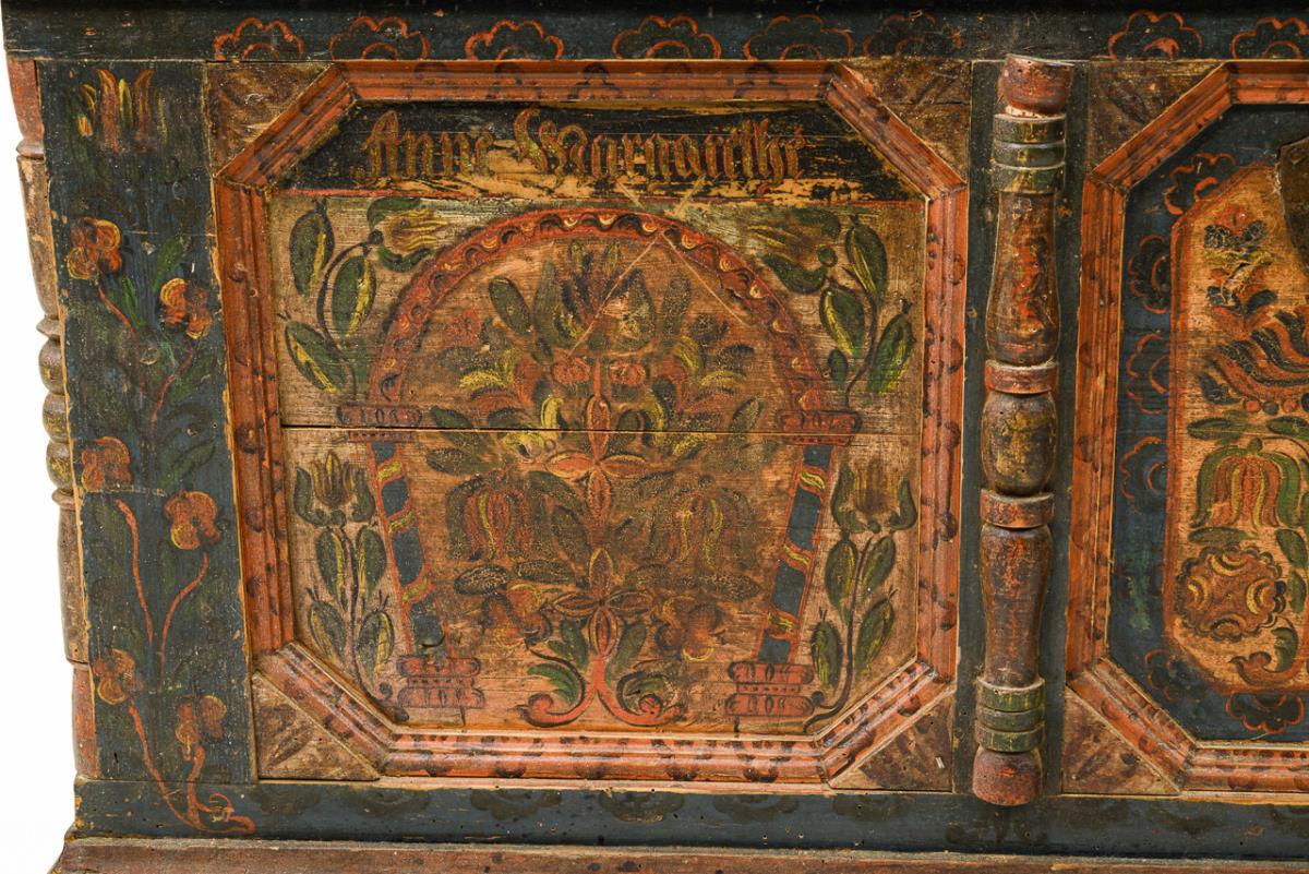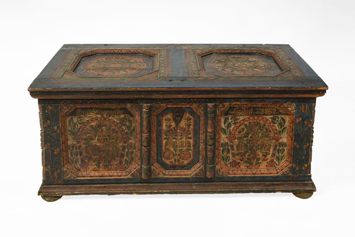 Kastentruhe in Brettbauweise mit kassettierten Feldern und Bügelgriffen an den Seitenwänden, blau gefasst mit polychromer Blumenbemalung, bezeichnet "Anne Margarethe Schick, 1852"; innen mit Beifach. Alters-/Gebrauchsspuren, inaktiver Anobienbefall, Bemalung teils berieben, kleine Retuschen.