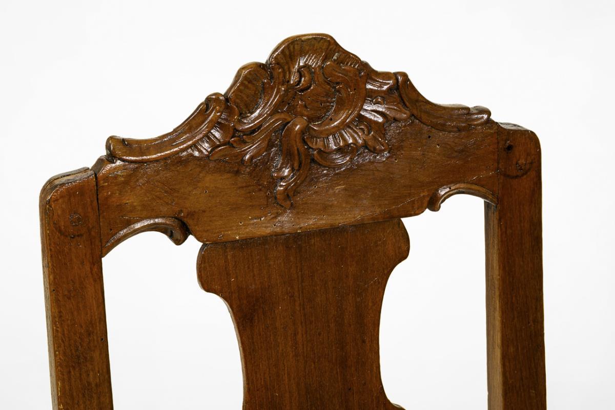 Stuhl mit erhöhter Rückenlehne, Beine mit geschwungener Fußverstrebung, Rückenlehne verziert mit Rocaillen-Schnitzwerk und geschweiftem Mittelbrett, gepolsterte Sitzfläche mit rotem Samtbezug. Alters-/Gebrauchsspuren, restauriert, Anobienbefall.