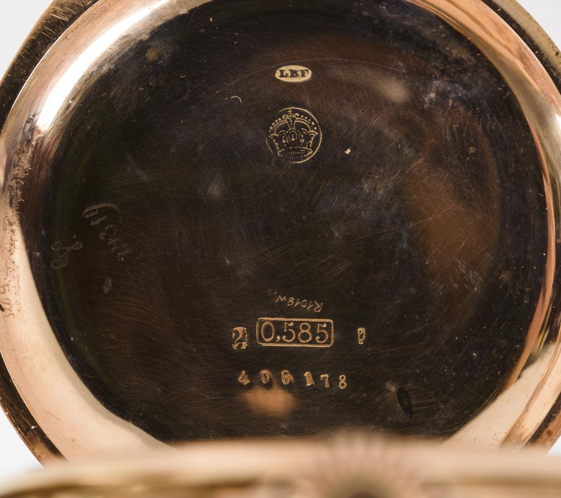 585 gepunzt, Feingehaltsstempel, Firmenmarke LBF, goldener Staubdeckel. Ø 5,3 cm. Uhr 98 g.