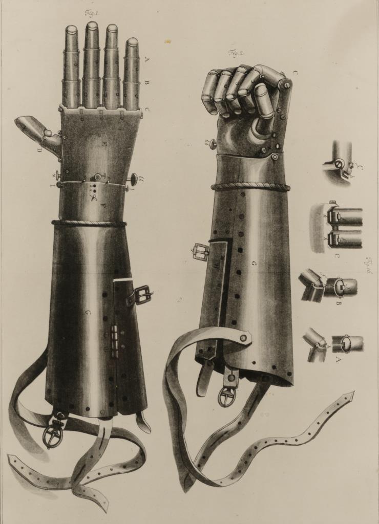 2 jüngere Nachdrucke der Studien des Christian von Mechel zur eisernen Hand, einer seltenen mechanischen Prothese, die Götz von Berlichingen entwarf und von einem Waffenschmied im Jahr 1504 hergestellt wurde .