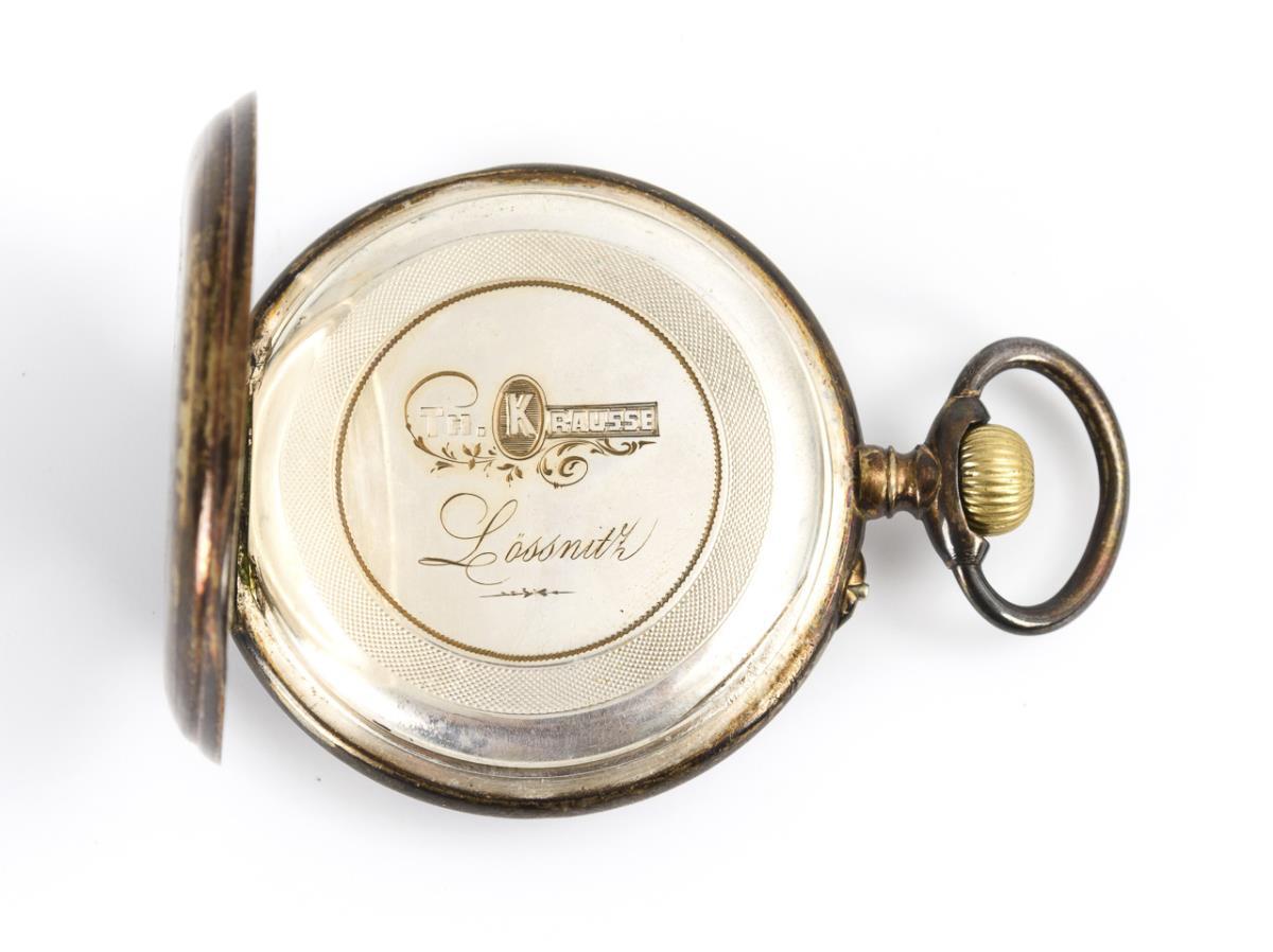 800/Halbmond/Krone/Firmenmarke, Schweizer Beschauzeichen gepunzt, silberner Staubdeckel, bezeichnet "Th. Krausse Lössnitz". Ø 5,1 cm. 91 g.