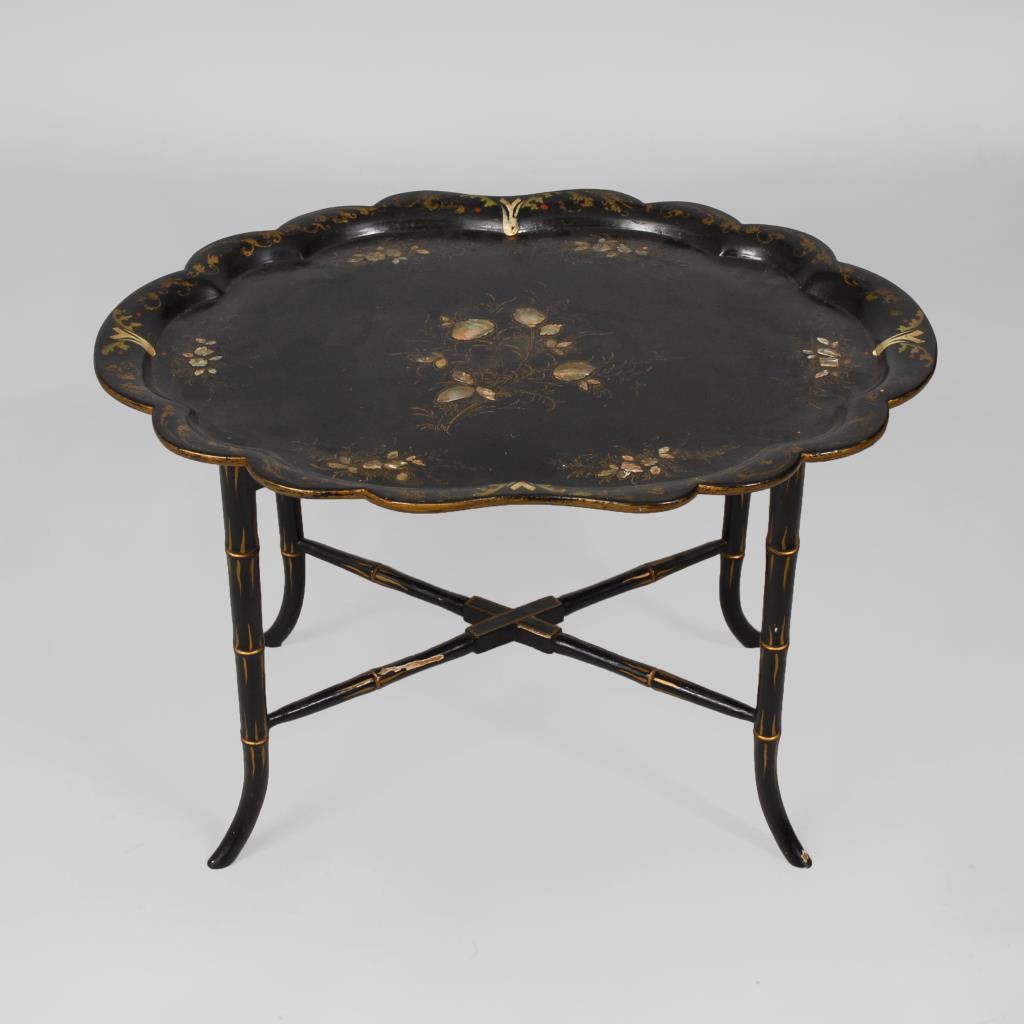 Eleganter Beistelltisch mit geschwungener Platte, 4 Beine in Bambusform mit Kreuzverstrebung, dekoriert mit floraler Goldbemalung und Perlmutt-Einlagen. Alters-/Gebrauchsspuren, Bemalung berieben.