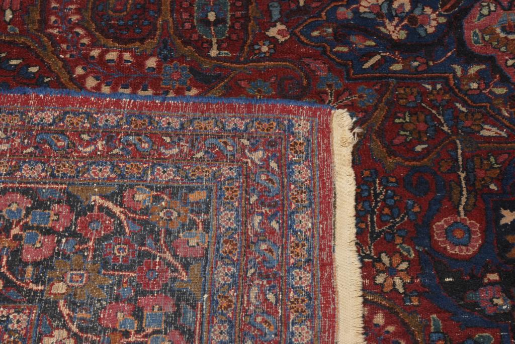 Wolle, feine Handknüpfung. Polychromdekor mit vorwiegend Kirschrot, Nachtblau und Elfenbein.263 x 360 cm.