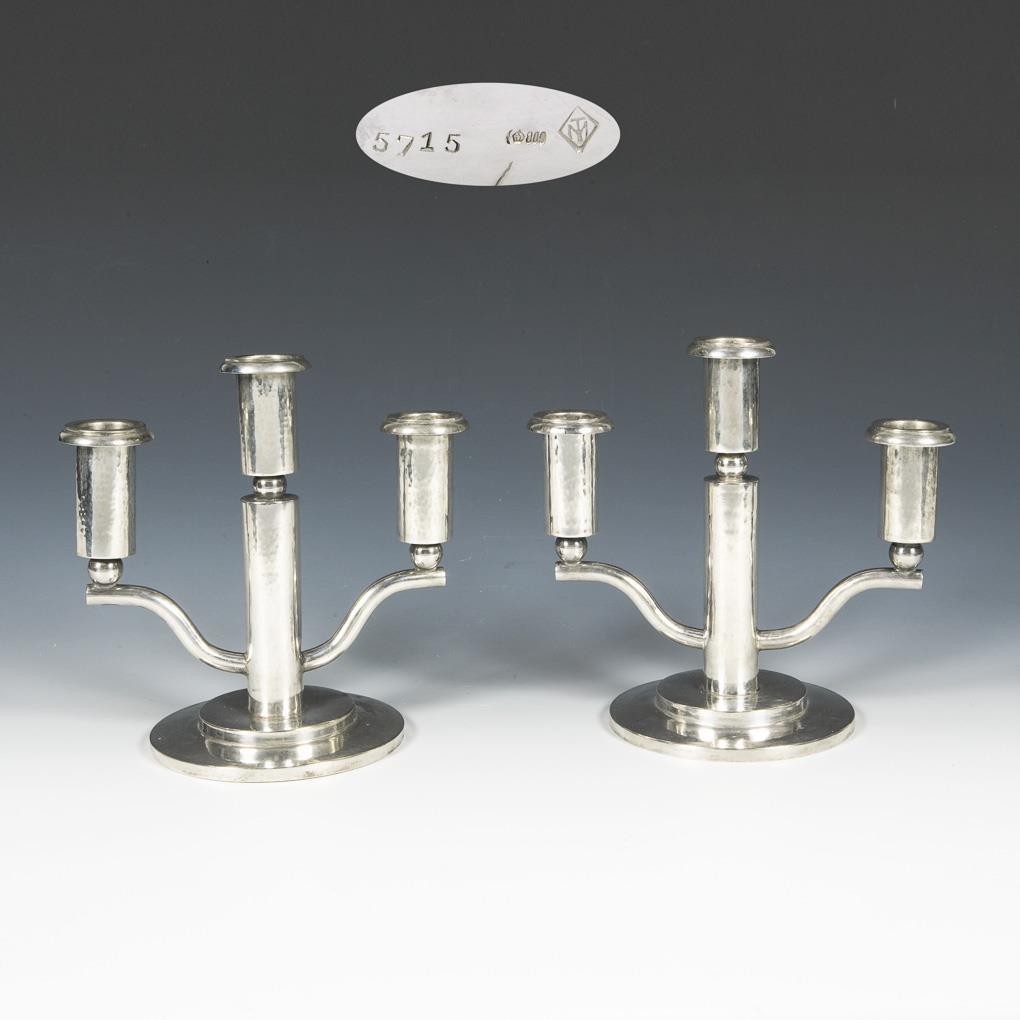 3-flammige Standleuchter mit Hammerschlagdekor. Punzen: Halbmond und Krone, Feingehalt, Modell-Nr. 5715, Fabrikmarke.