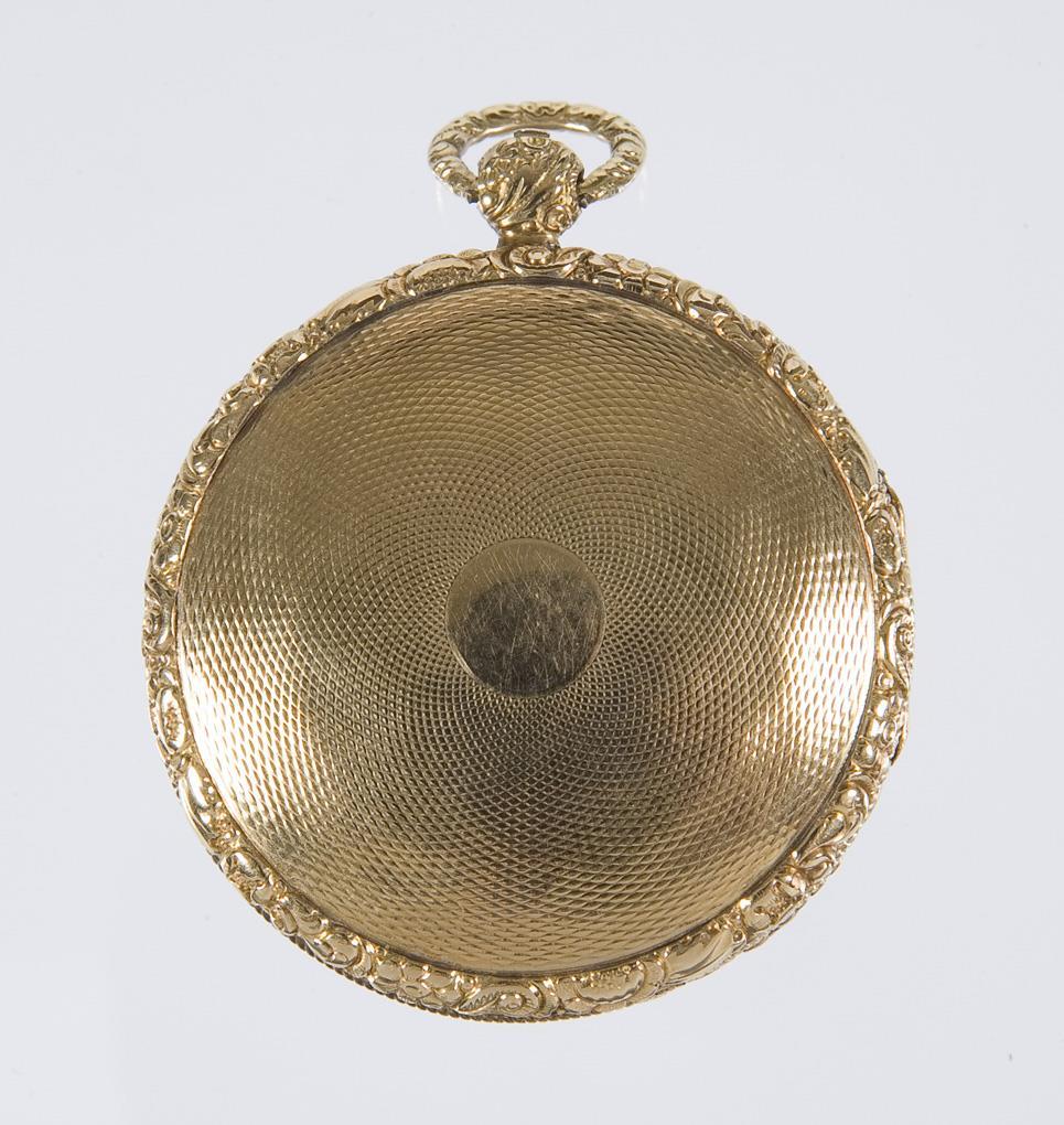 Vergoldetes Spindelwerk mit Regulierzifferblatt, Kette und Schnecke. Filigran gearbeiteter Kloben. Silbernes, im Zentrum guillochiertes Zifferblatt, römische Zahlen, grazile Zeiger. Schlüsselaufzug. Ohne Punzen, Feingehalt mit Säure geprüft. Im Kurzzeit-Test funktionstüchtig. Deckel mit Dellen, im Deckel zwei kleine Lötstellen, Kratzer, Glasdeckel schließt nicht.