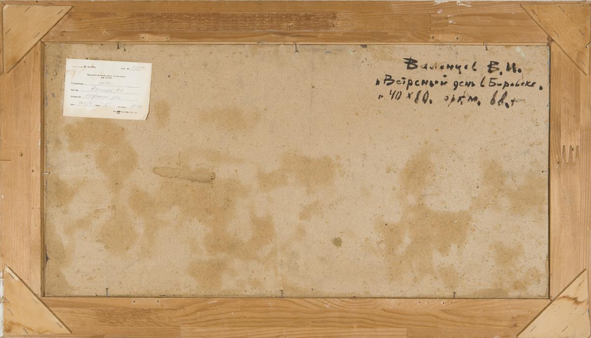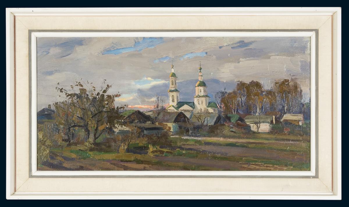 Rückseitig kyrillisch bezeichnet, kyrillischer Ausstellungs-Klebezettel. Weiß gefasster Profilrahmen mit Leinenbezug.