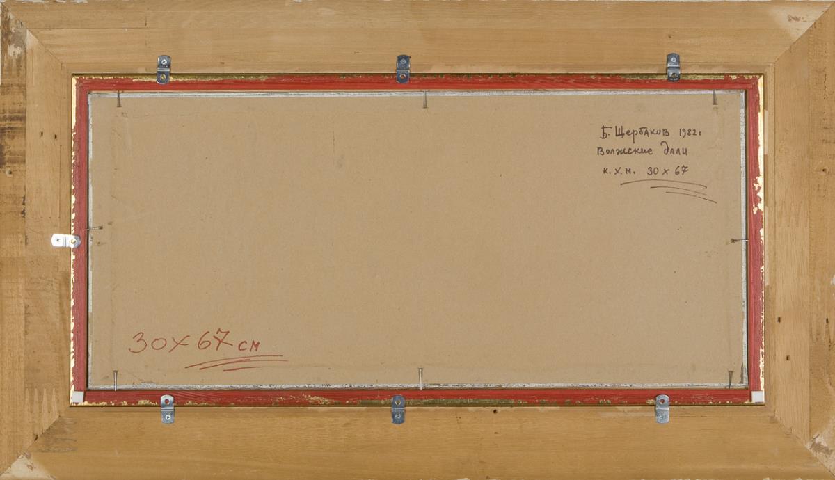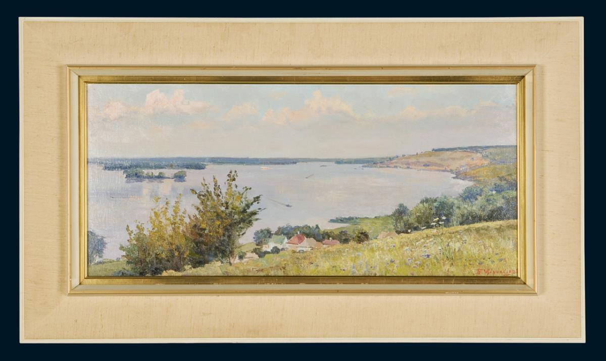 Detailliert ausgeführte, überlegt komponierte Sommerlandschaft in hellem Kolorit. Die große Wasserfläche ist reizvoll zergliedert. Rückseitig kyrillisch bezeichnet. Profilierter Rahmen mit Goldleiste und Leinenbezug.