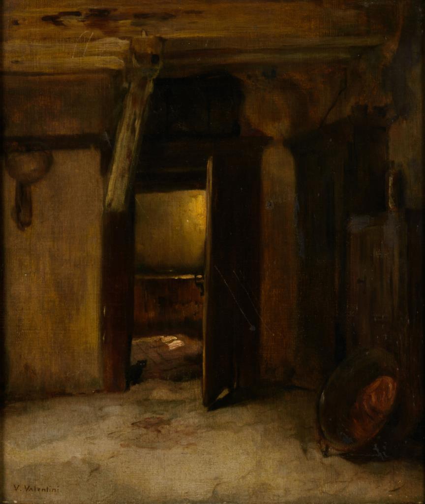 Bauernstube mit Katze in der offenen Tür. Ein kleiner Defekt.