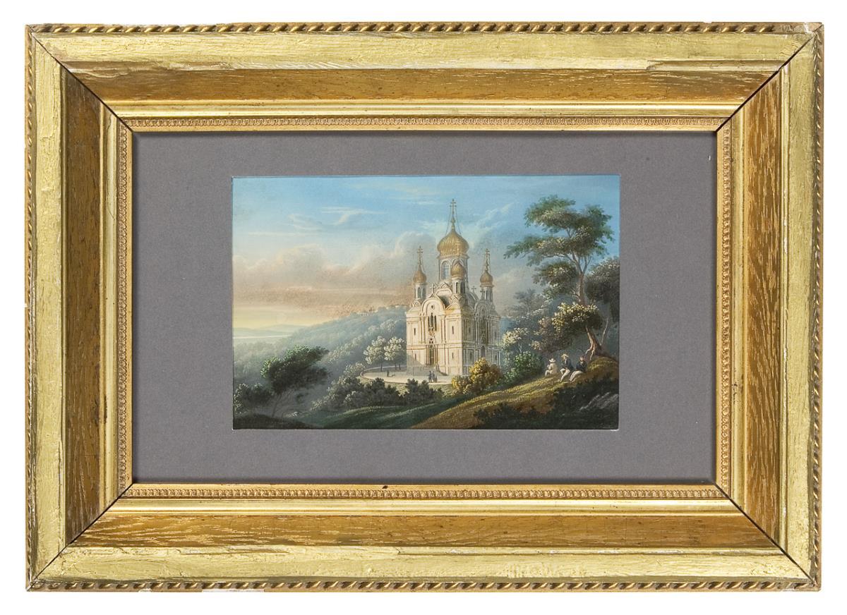 Minutiös gemalte Ansicht mit Figurenstaffage. Herzog Adolph von Nassau ließ sie als Grabeskirche für seine verstorbene Gattin Elisabeth Michailowna (1826-1845, Großfürstin von Russland und eine Nichte der Zaren Alexander I. und Nikolaus I.) erbauen. Passepartout, verglaster Goldrahmen. Rahmen partiell defekt.