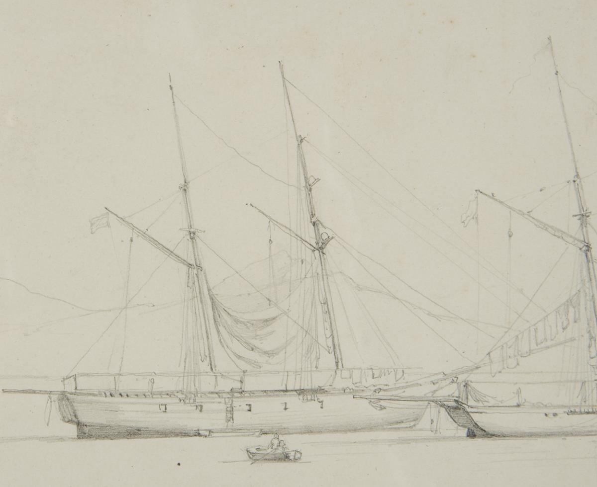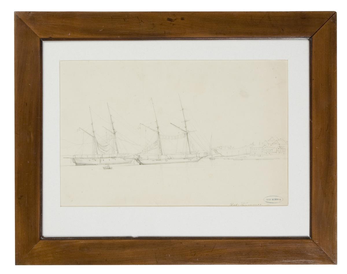 Mit spitzem Stift, in zarten Linien gemalte Ansicht mit Nachlass-Stempel. Passepartout, verglaster Rahmen.