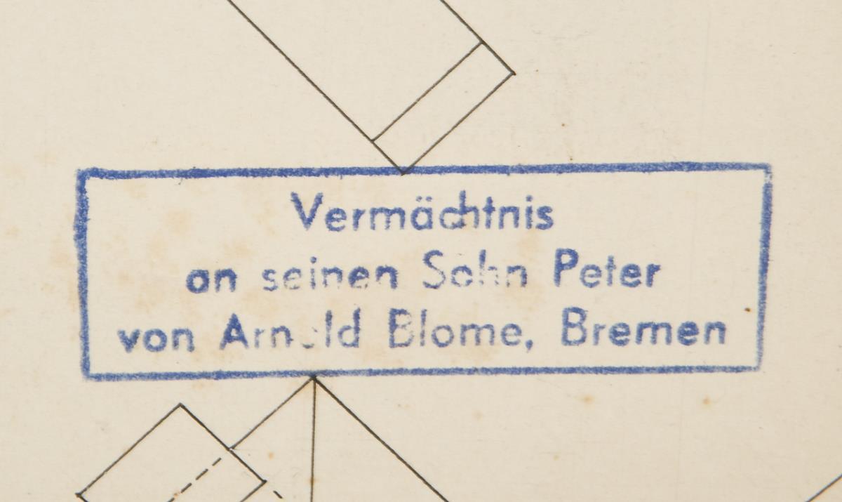 Arnold Blome (1894-1972), Künstler, Kunstsammler, Kunsthändler. Legte in den 1940er Jahren testamentarisch fest, dass seine Sammlung an diverse Museen aufgeteilt werden sollte, verschenkte jedoch 1947-1965 bereits selbst große Teile seiner Sammlung an Museen, Archive, Vereine. Die Schenkungen sind alle mit Vermächtnis-Stempeln gekennzeichnet * Partnerauktion Bergmann.