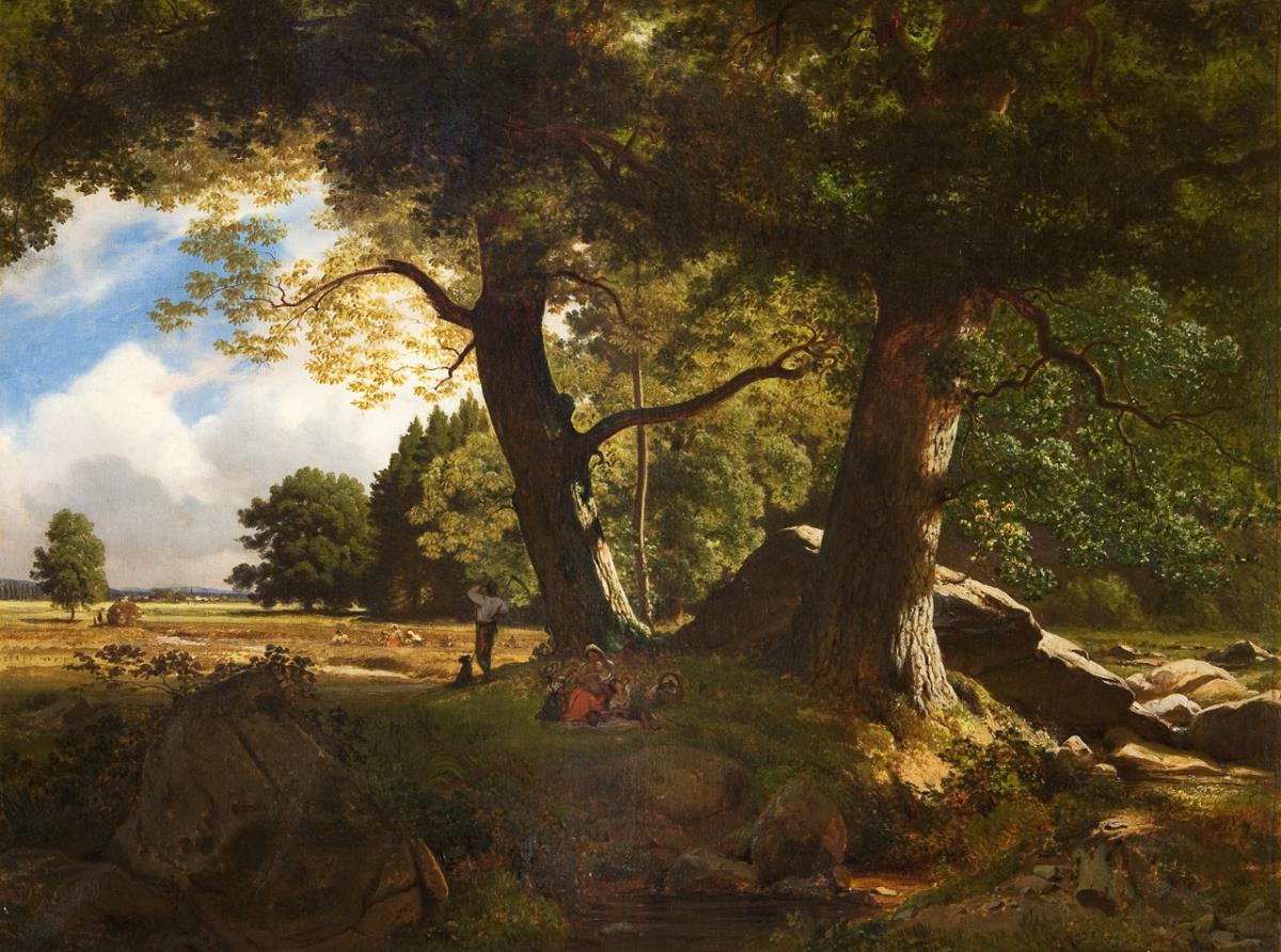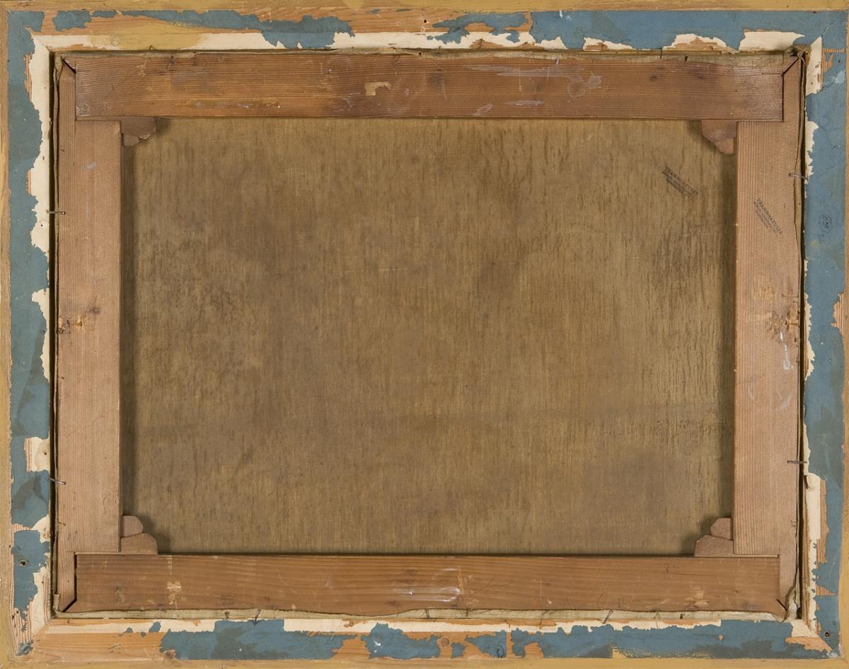 Geschildert wird ein malerisch-romantisches Leben der Landbevölkerung in einer Landschaft mit einer ausgeprägten Dunkelzone und hell erleuchteten Abschnitten. Originaler Keilrahmen mit Berliner Stempel, profilierter Goldrahmen.