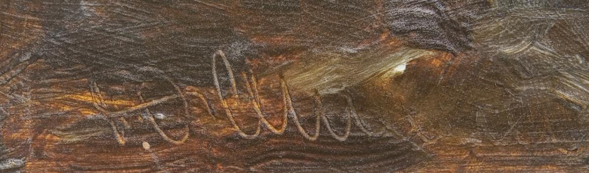 Motiv in einer malerisch aufgelösten, Farbmassen und Stimmungswerte betonenden Malweise. Rückseitig Monogramm-Siegel. Vergoldeter Stuckrahmen.