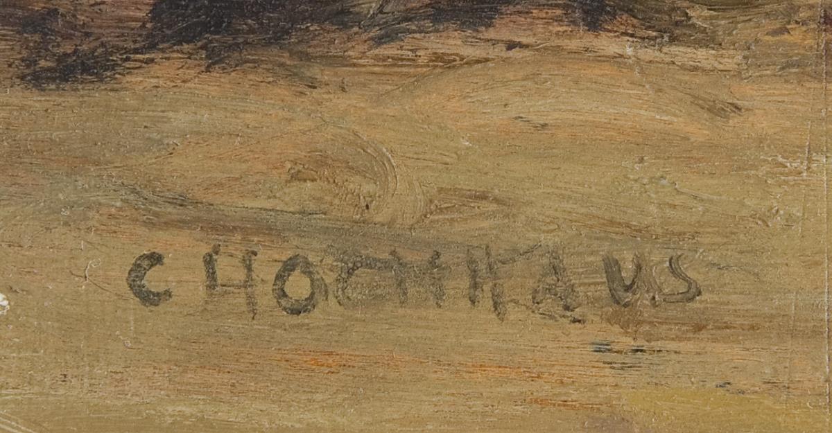 Hochhaus, Genre- und Landschaftsmaler, studierte an der Akademie in Berlin. Schüler von Anton Alexander von Werner. Seit 1876 regelmäßig auf den Berliner Ausstellungen vertreten * Partnerauktion Bergmann.