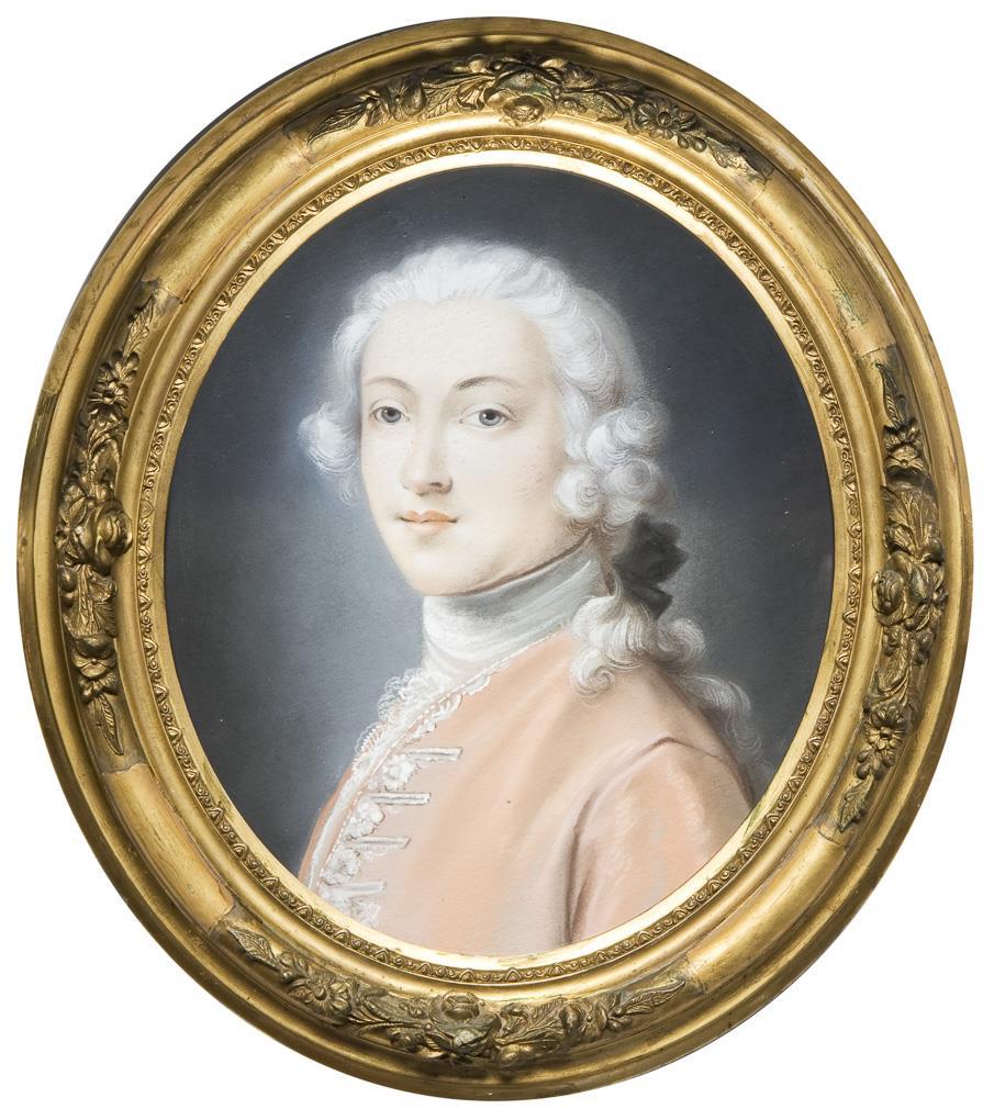 Brustbild eines jungen Mannes mit gepuderter Perücke und Jabot im Stil aus der Zeit von Louis XVI. Verglaster vergoldeter Stuckrahmen.