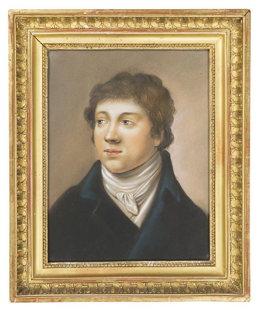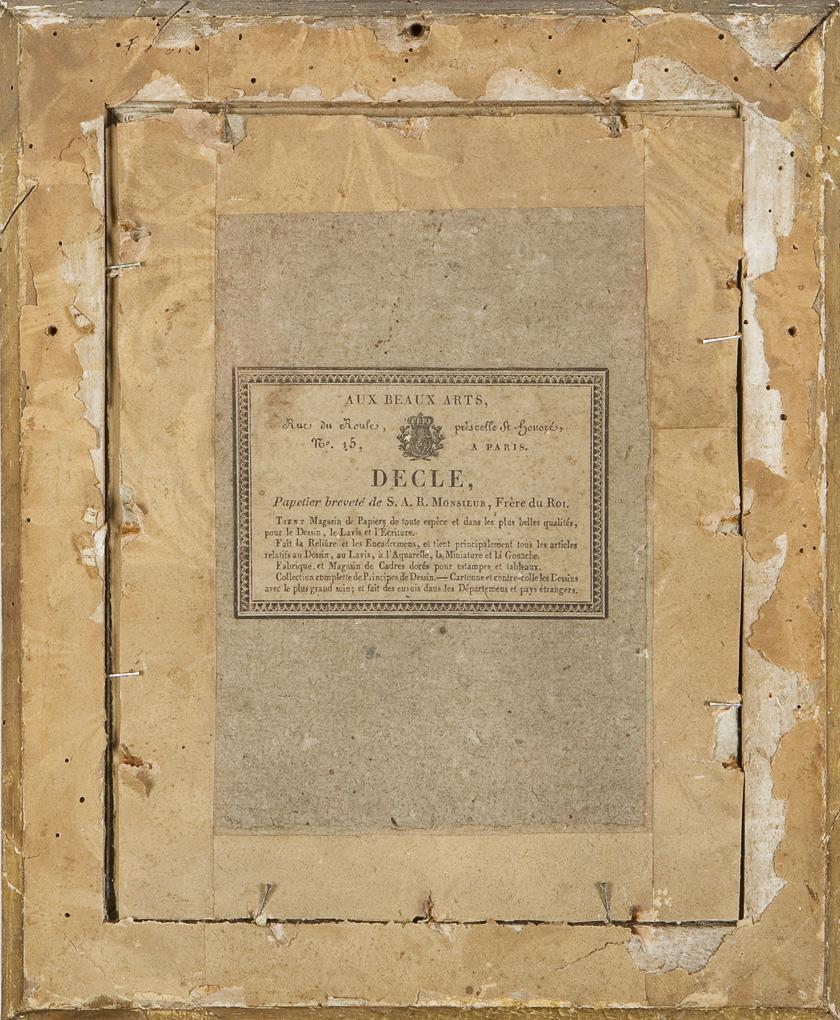 Brustbildnis eines jungen Mannes in typischer Kleidung, um den Hals einen langen Seidenschal mehrfach eng gebunden, mit einem Knoten zugeschnürt. Rückseitig alter Pariser Klebezettel. Verglaster vergoldeter Stuckrahmen.