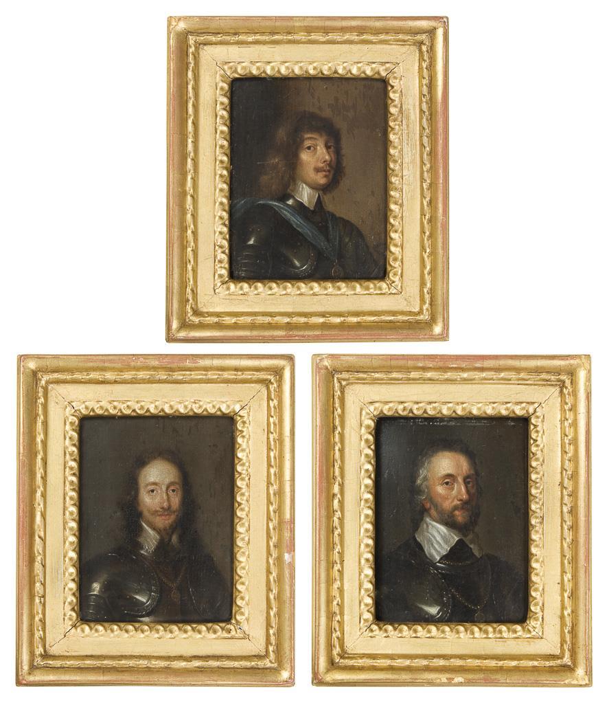 Charles I. (1600 Dunfermline - 1649 London, aus dem Haus Stuart, 1625-1649 König von England, Schottland und Irland). Thomas Howard, 21th Earl of Arundel (1585 Finchingfied - 1646 Padua, Diplomat, Kunstsammler). Algernon Percy, 10th Earl of Northumberland (1602 London - 1668 Dublin, Lord High Constable of England, Earl Marshal of England). Profilierte Goldrahmen. Eine Platte leicht gewölbt.