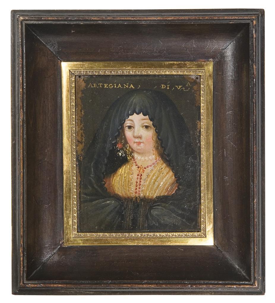 Bezeichnet, ein Profilrahmen mit Messingleiste, ein Goldrahmen. Damenporträt am Rand mit Farbverlusten, Herrenporträt mit kleinem Farbabplatzer oben.