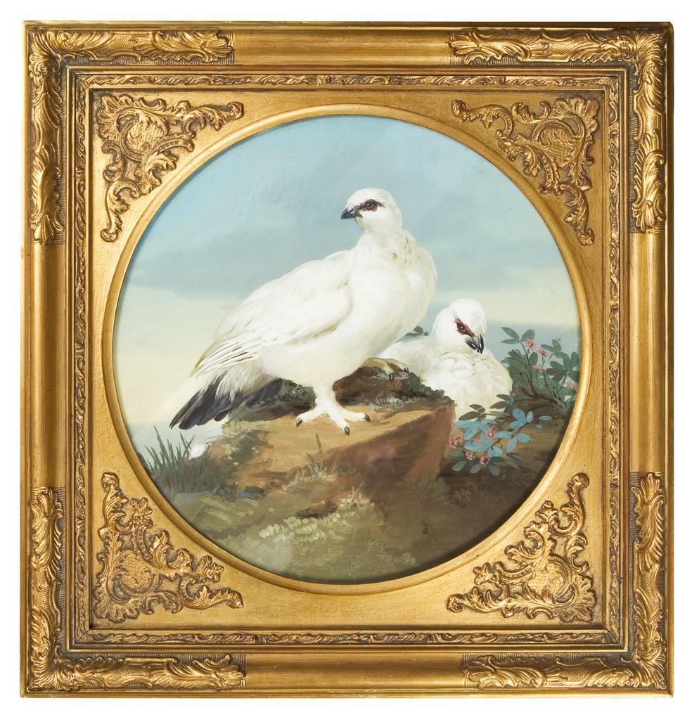 Die Tiere sind kühn nah am Betrachter in den Vordergrund plaziert, zum eigentlichen Gegenstand des Bildes gemacht. Schwerer verglaster vergoldeter Stuckrahmen.