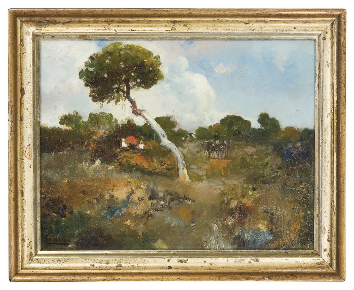 Impressionistisch angelegter Landschaftsausschnitt, undeutlich bezeichnet. Profilierter Waschgoldrahmen.