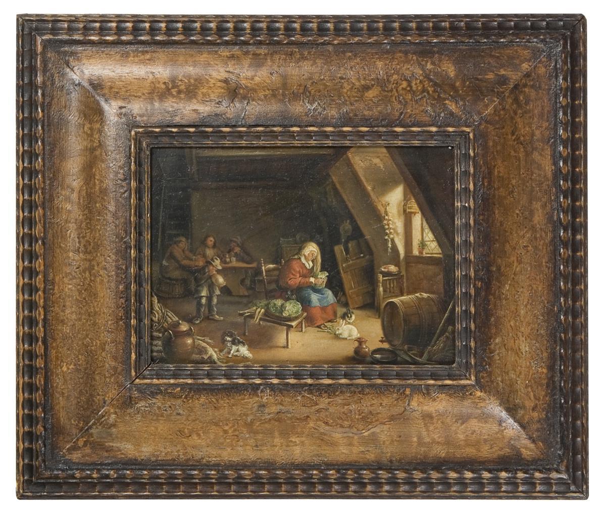 Kleinformatige, vielfigurige und detailreiche Darstellung nach einem flämischen Altmeister. Breiter Flammleistenrahmen.