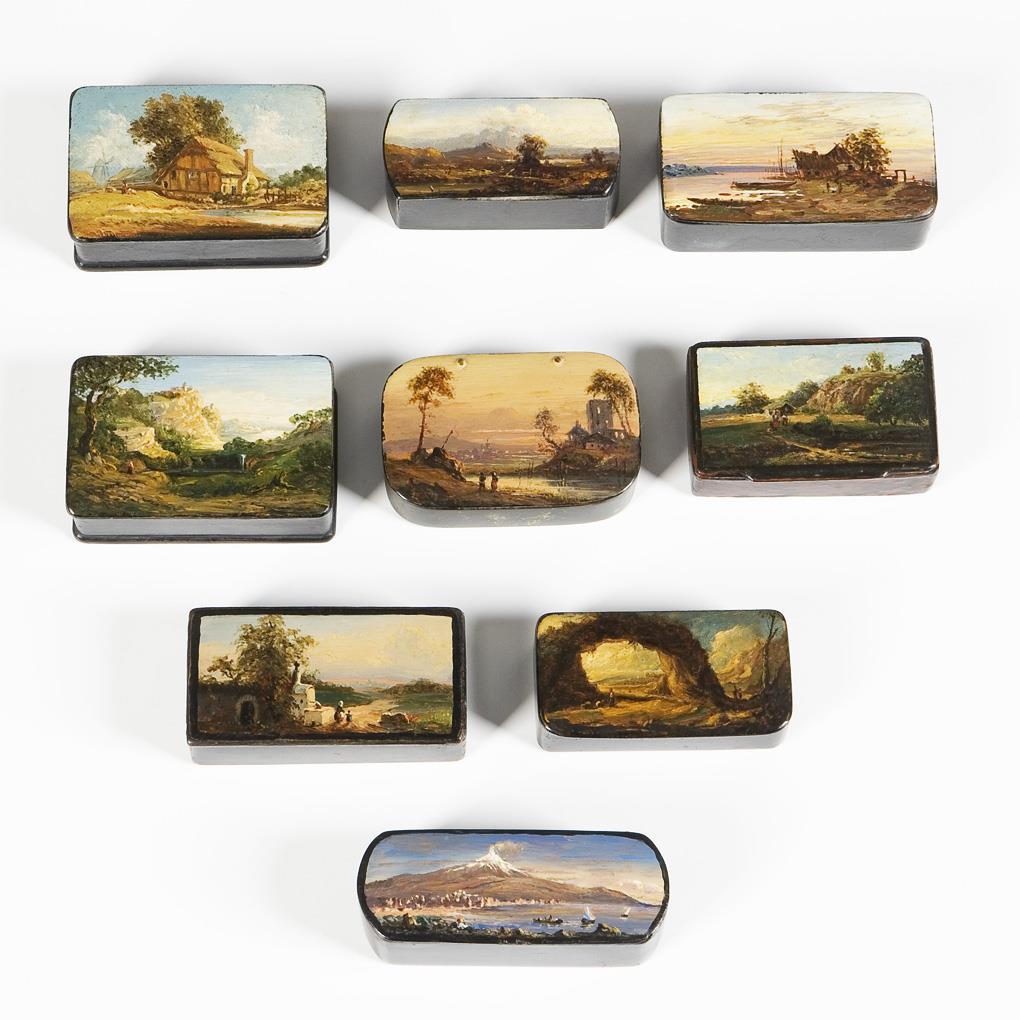 Sammlung von neun Lackdosen mit Landschaftsmalerei.