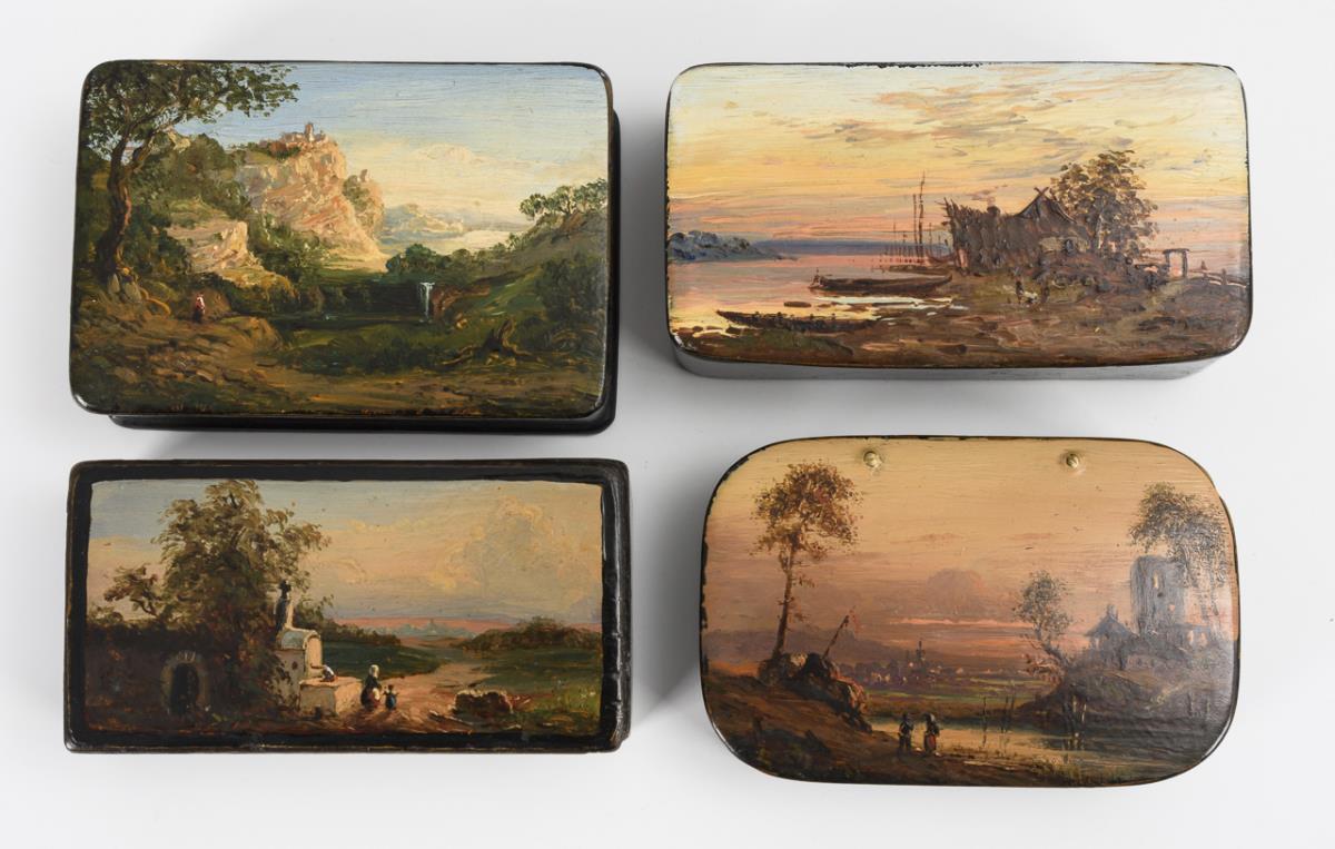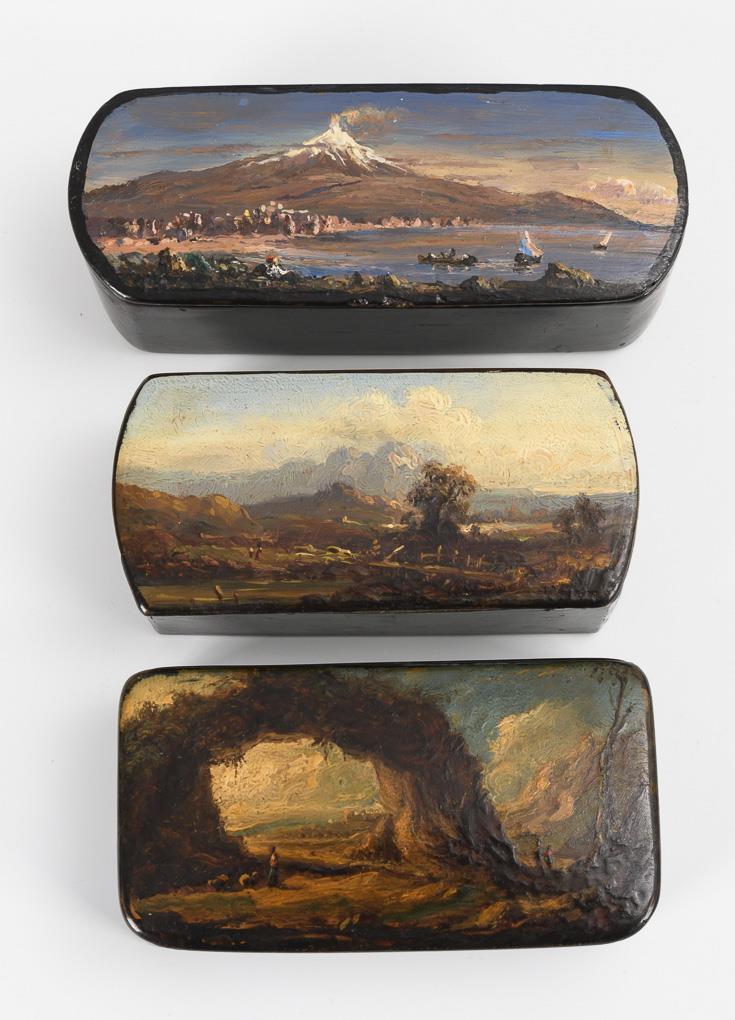 Papiermaché, schwarz lackiert. Deckel mit neun verschiedenen romantischen Ansichten farbig bemalt. Rechteckige, teils gerundete Form mit bündig schließendem Scharnierdeckel. Eine Dose rotbraun lackiert. Ein Innendeckel bestoßen.