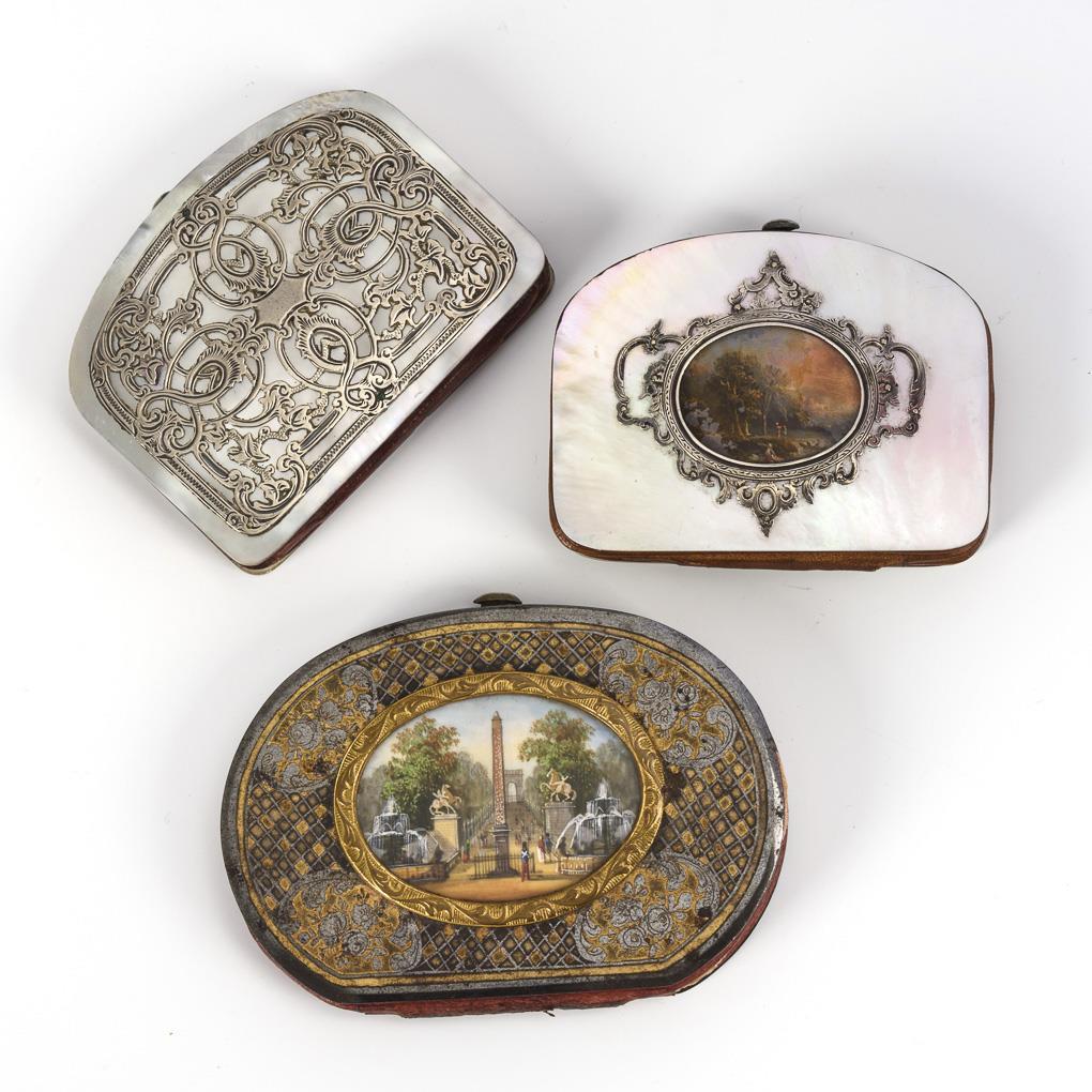 Zwei Permutt-Börsen mit Metall-Applikationen. Eine Metall-Börse mit tauschiertem Dekor. Davon zwei Börsen mit farbigen Miniatur-Landschaften in ovalen Kartuschen. Je drei Stoff-Innenfächer. Leichte Gebrauchsspuren.