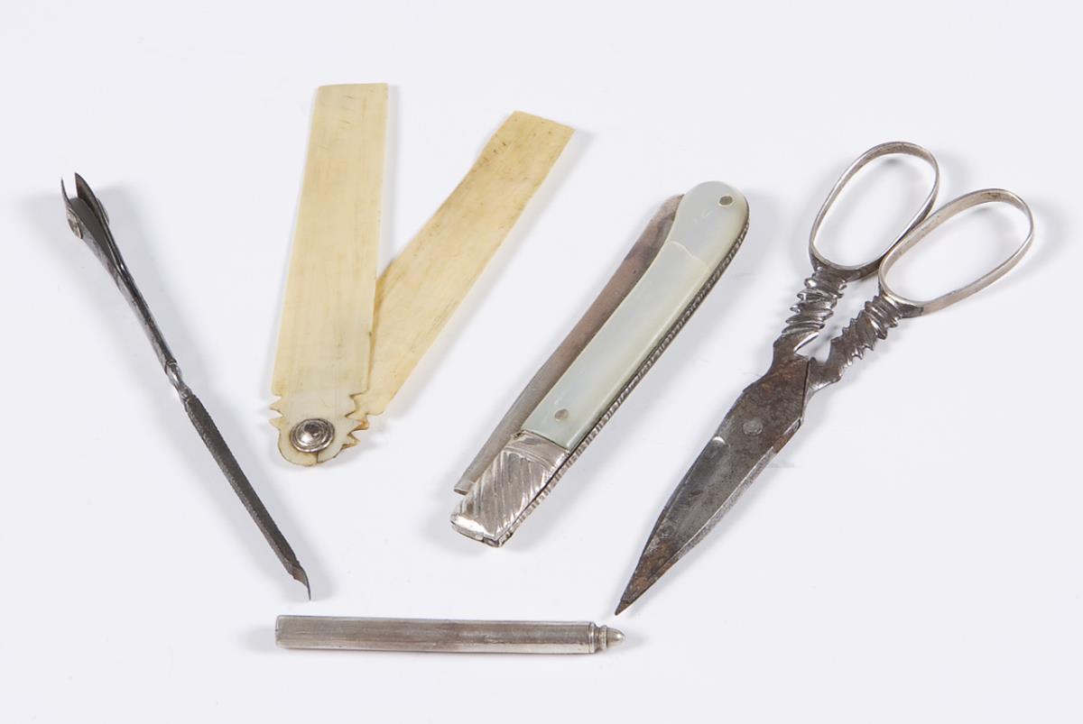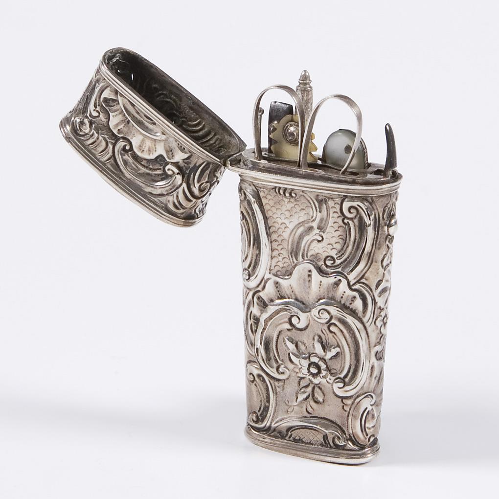 Köcherförmiger Korpus mit Scharnierdeckel, Druck-Knopf und sechs Reise-Utensilien. Umlaufend Blüten-, Rocaillen- und Muscheldekor. Ohne Punzen, Feingehalt mit Säure geprüft. Gebrauchsspuren, Deckel partiell restauriert.