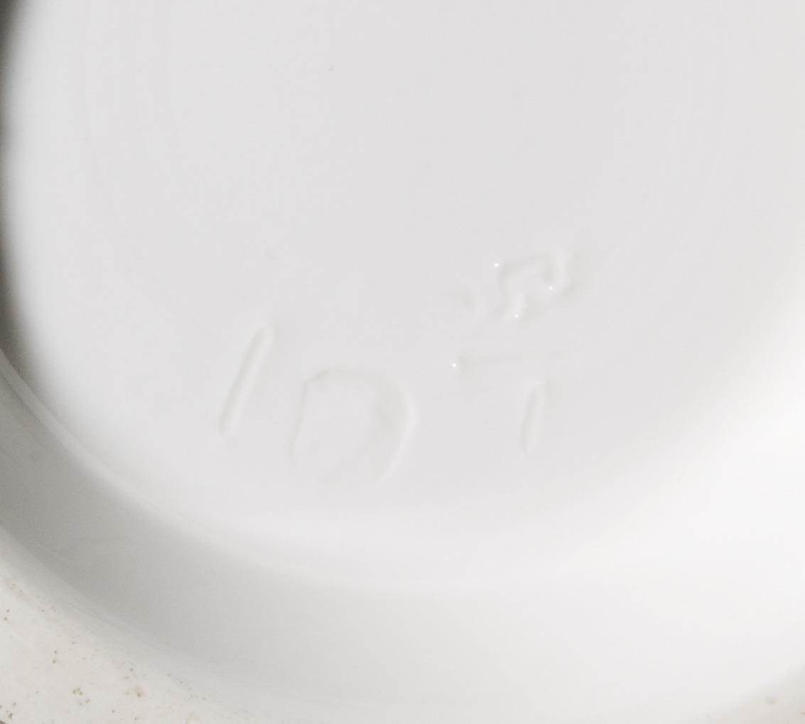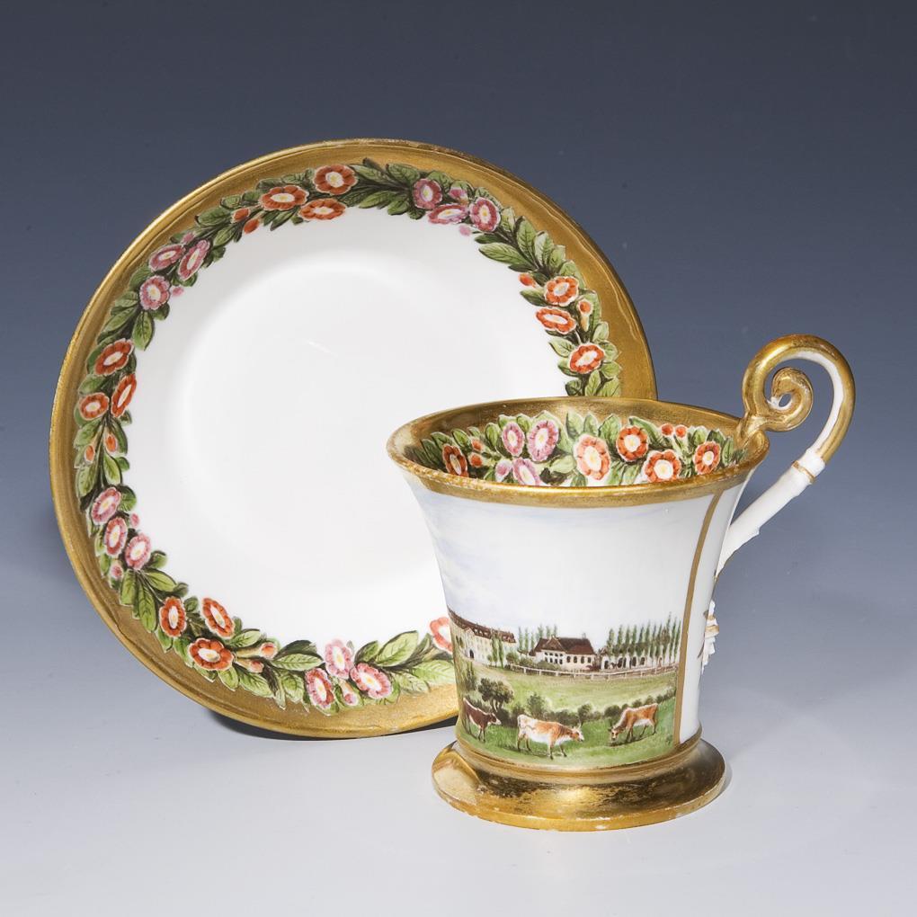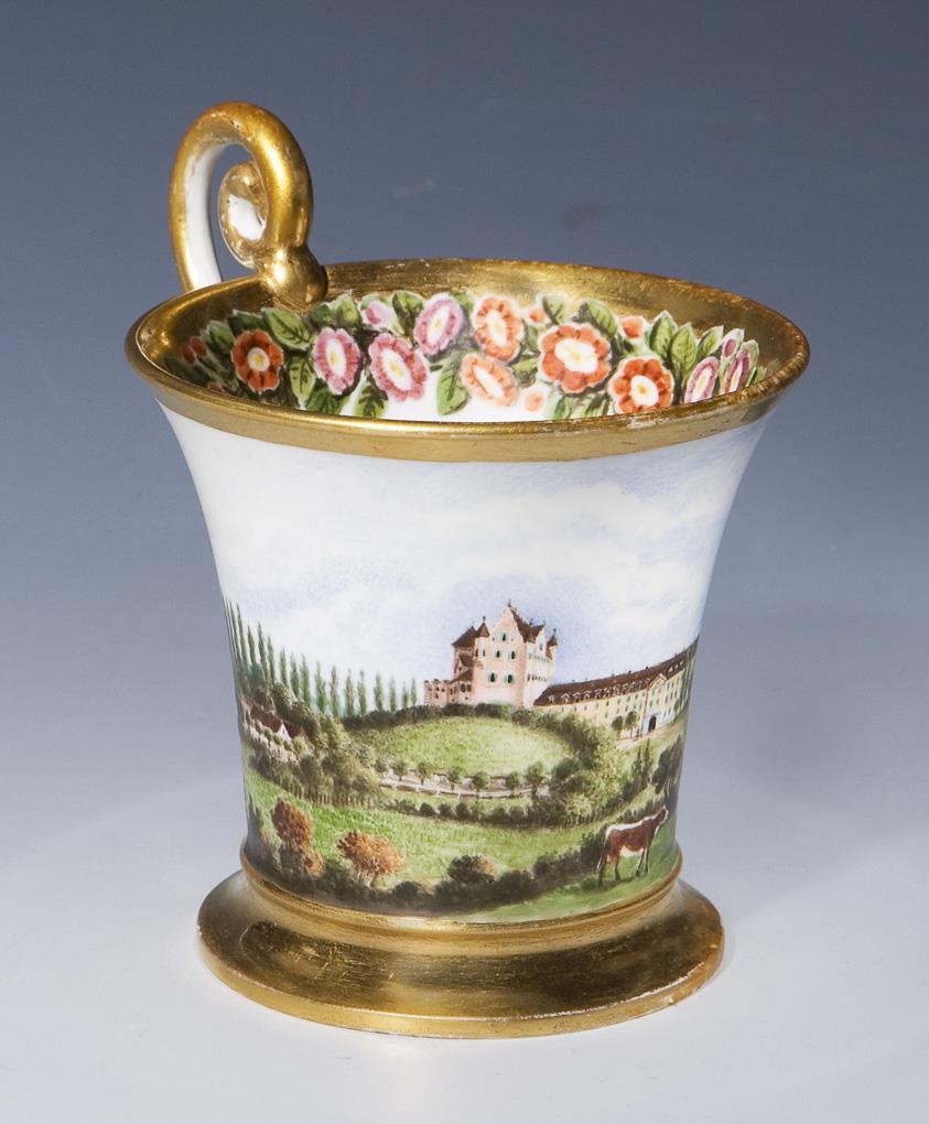 Form "Becher antik Nr. 11" mit hochgezogenem Henkel an bärtigem Maskaron. Frontal großflächige farbige Landschaftsmalerei mit Weidevieh. Farbige Blumen-Blattbordüren, Goldstaffage. Ritzmarken, Tasse mit undeutlicher Pressmarke mit Rautenschild. Goldränder, Henkel an beriebenen Stellen übermalt.