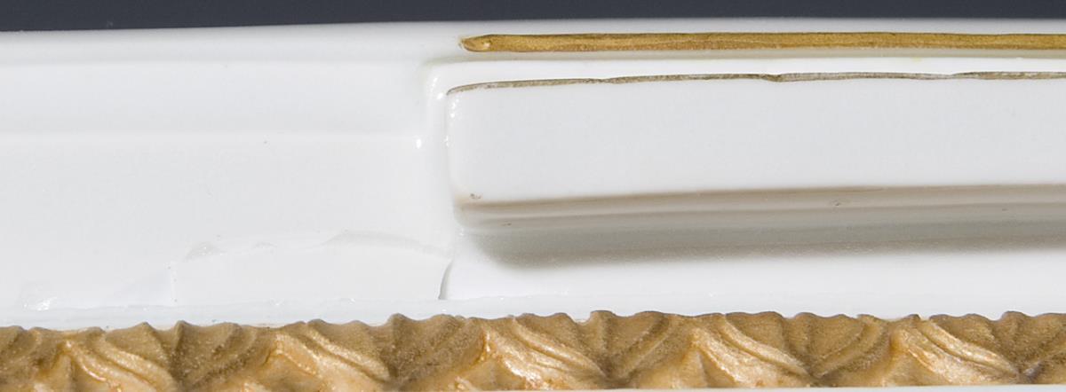 Ornamental und floral reliefiert, pastellfarben und gold staffiert, mattiert, Reliefgold. Beidseits feine farbige Genre-Bemalung nach Gemälde-Vorlagen "Mädchen mit Lamm, "Mädchen am Ententeich". Ritzmarke, Pressmarke, goldene und schwarze Malermarken, rote Reichsapfelmarke, blaue Zeptermarke. Zwei Haarrisse am unteren Korpus, davon ein Riss leicht restauriert, Bodenkante von unten leicht bestoßen.