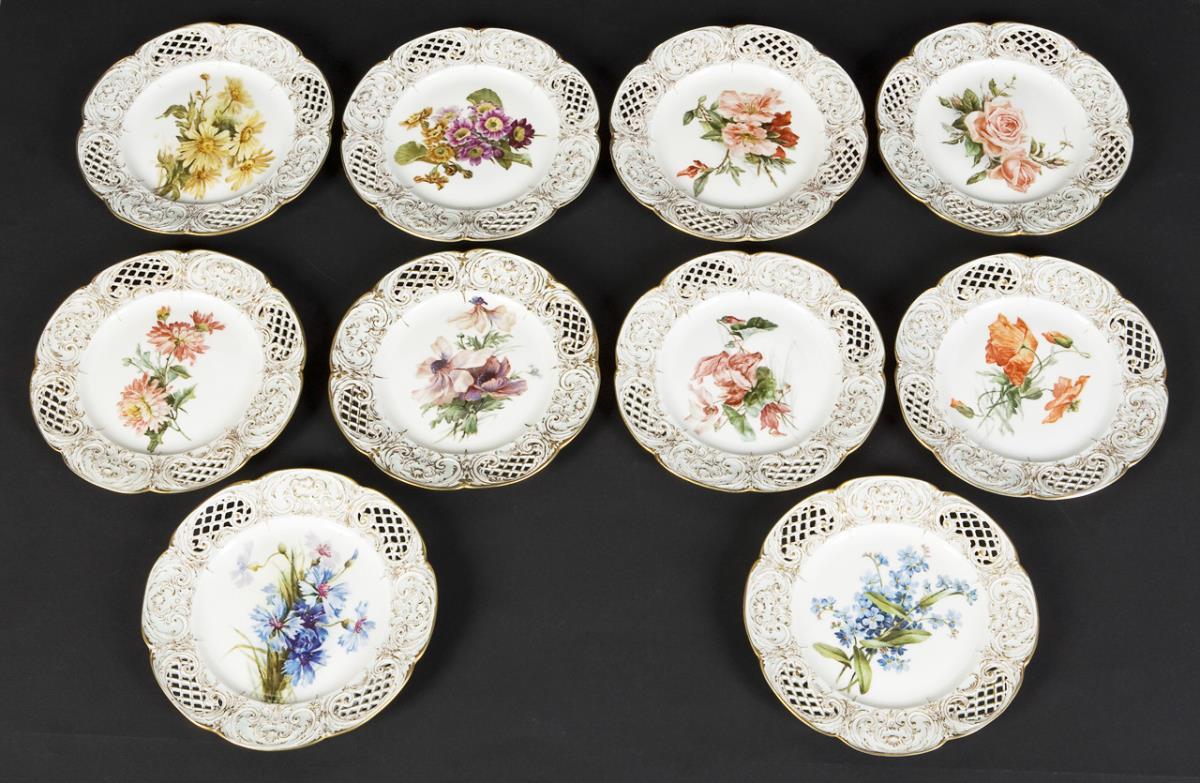Rokoko-Form, Form-Modell von Julius Mantel 1872. Reliefiert, gold staffiert, Fahne mit pastellfarbenem Fond, farbig bemalt. Im Spiegel großflächig gemalte zehn verschiedene Blütenmotive. Pressmarken, blaue Zeptermarken einmal gestrichen, ohne Malermarken.