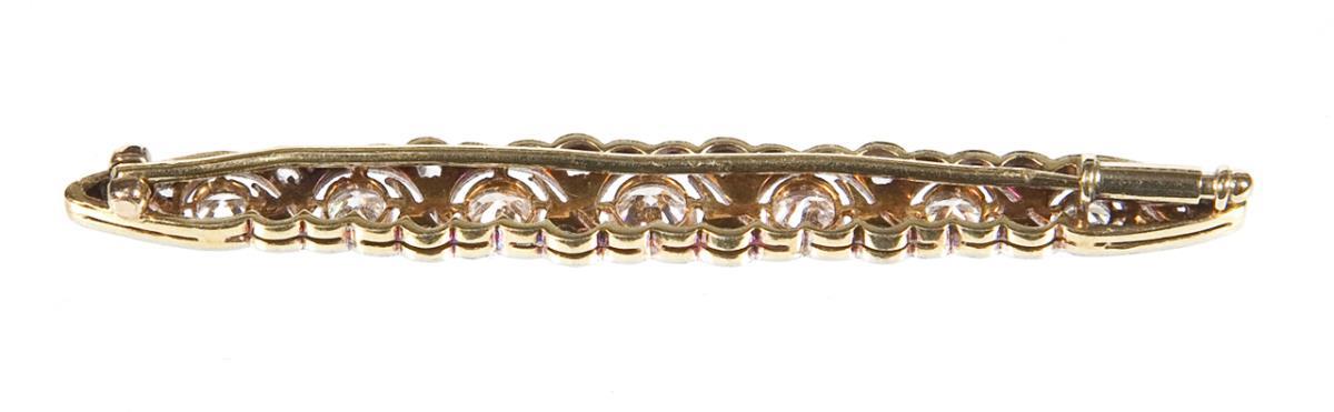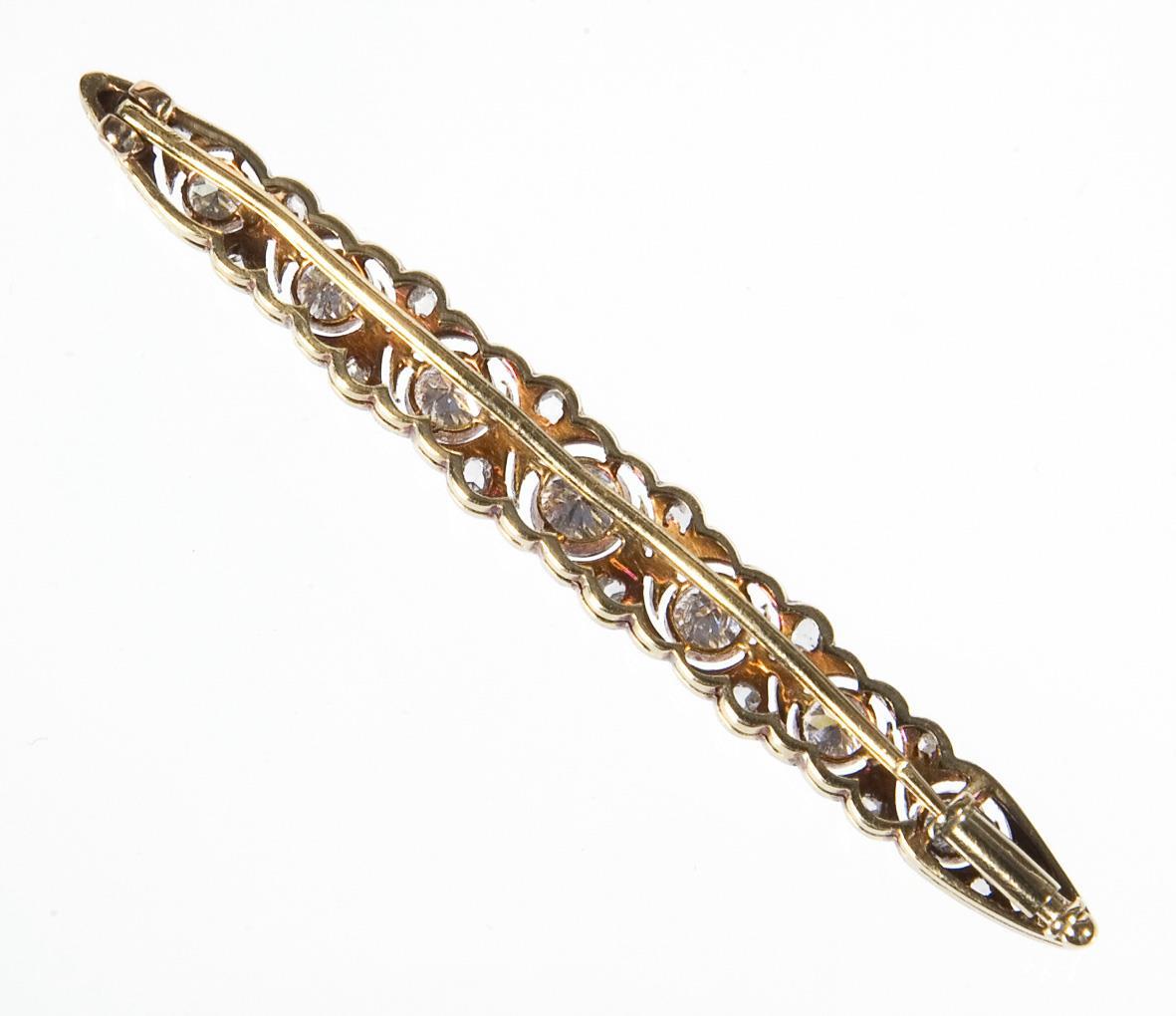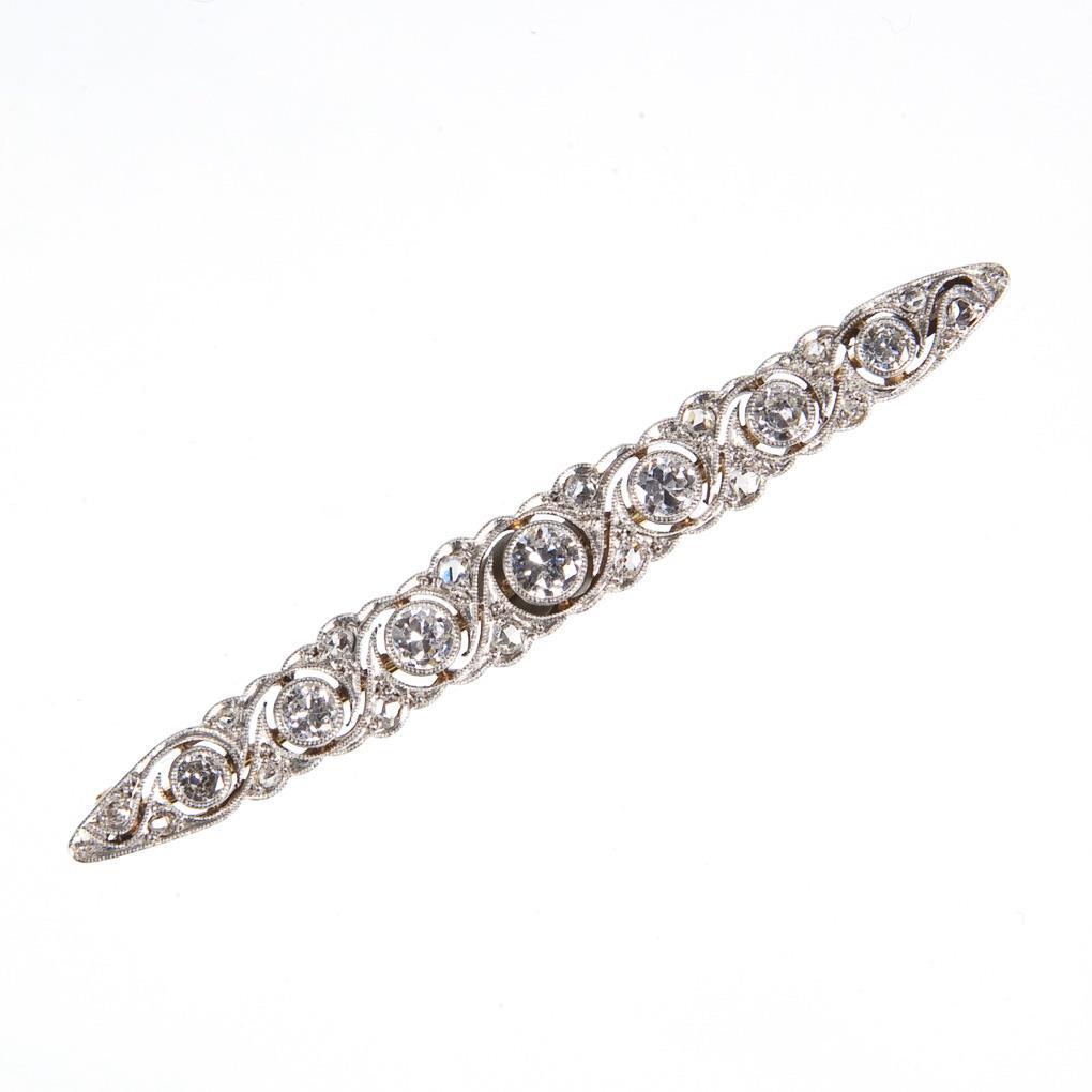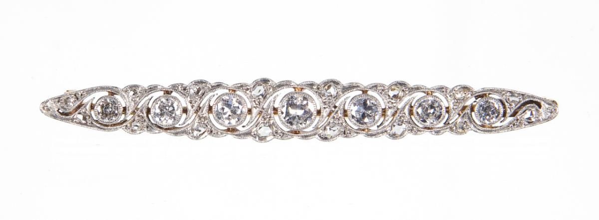 Durchbrochen gearbeitete Stabform. 7 Diamanten circa 1 ct, 16 kleine Diamantrosen. Ohne Punzen, Feingehalt mit Säure geprüft. Nadel leicht verbogen.