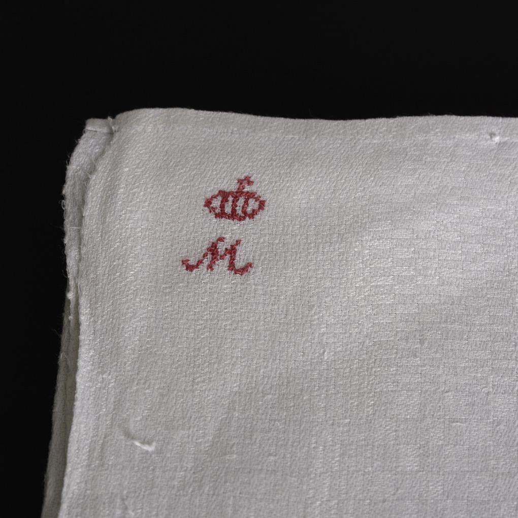 Feines handgewebtes Leinen, in der Mitte passig aus 2 Bahnen zusammengesetzt. Um 1850.