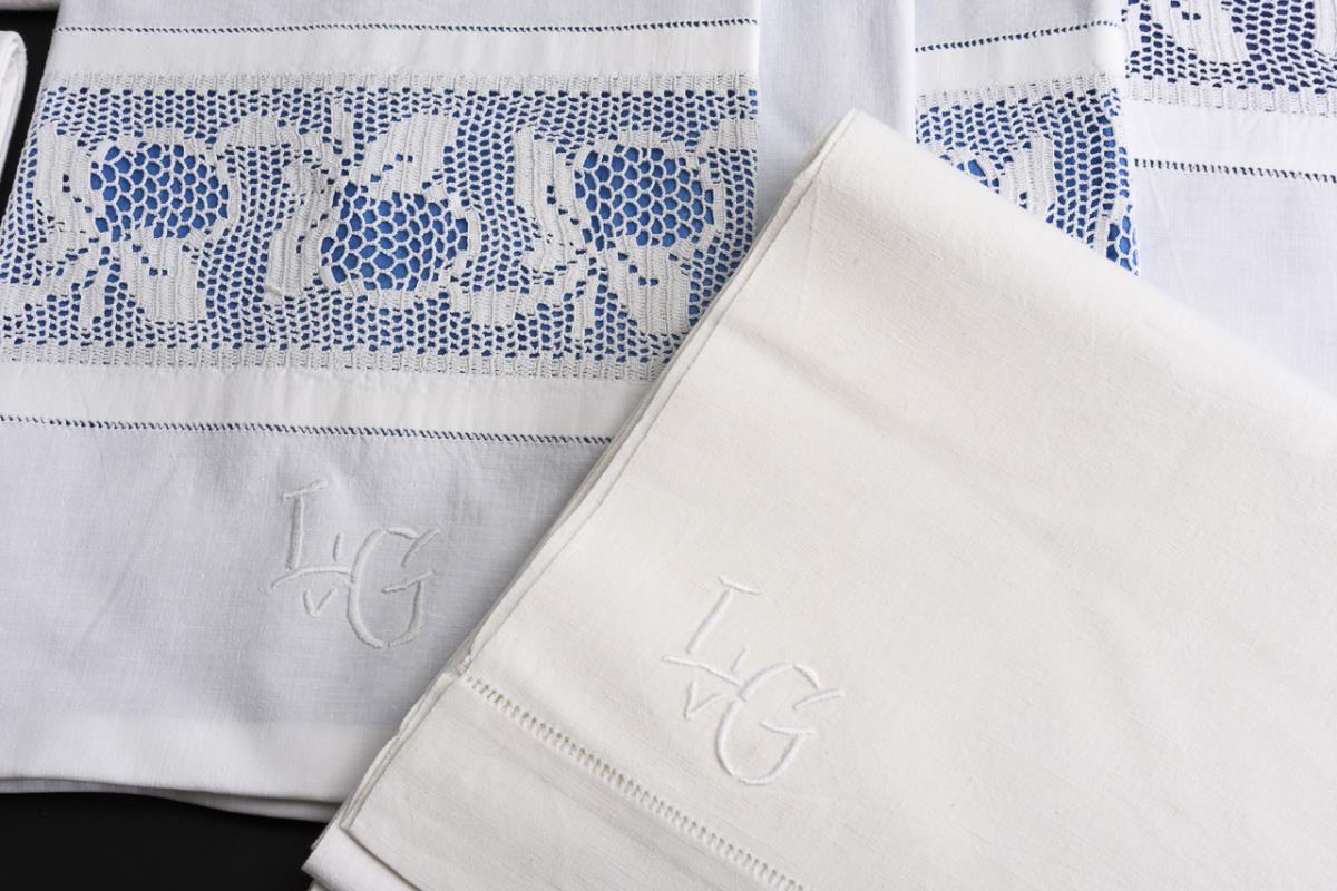 2 Überschlaglaken (235 x 148 cm) und 6 Kopfkissenbezüge (4 gleiche + 2 gleiche) mit Häkeleinsätzen (75 x 74 cm), 4 Laken mit Hohlsäumen (1 Laken 212 x 144 cm, sonst 220 x 132 cm). 1 Kissenpaar mit weißem Monogramm "vG", sonst je mit Monogramm "LvG".