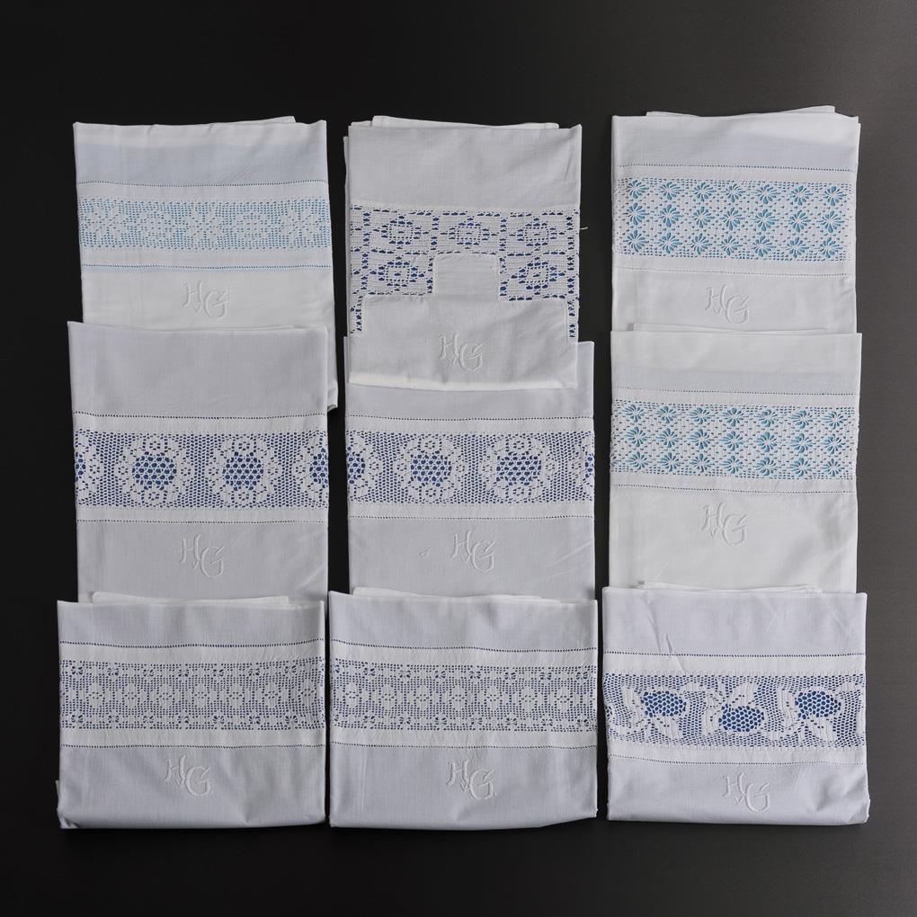 9 Kopfkissenbezüge mit Adelsmonogramm "HvG" um 1925.