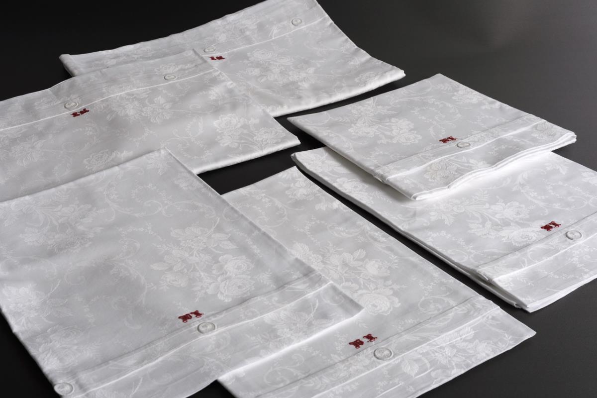 Zart eingewebtes Rosen-Nelken-Muster, feine Zwirnknöpfe und kunstvoll rot eingesticktes Monogramm "WL" 2 Bettbezüge (190 x 125 cm) und 4 Kopfkissen (81,5 x 78 cm). Unbenutzt / einmal gewaschen.