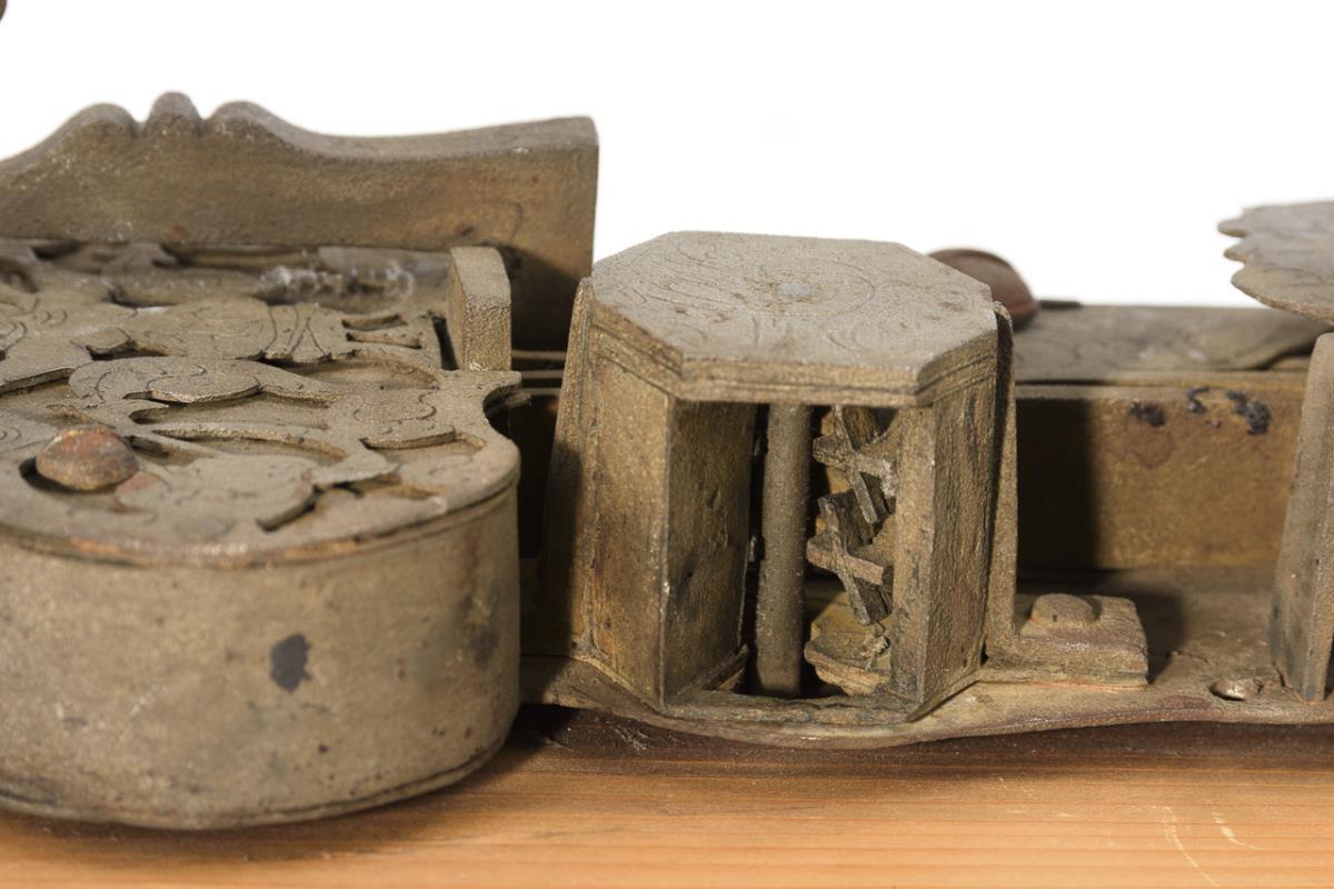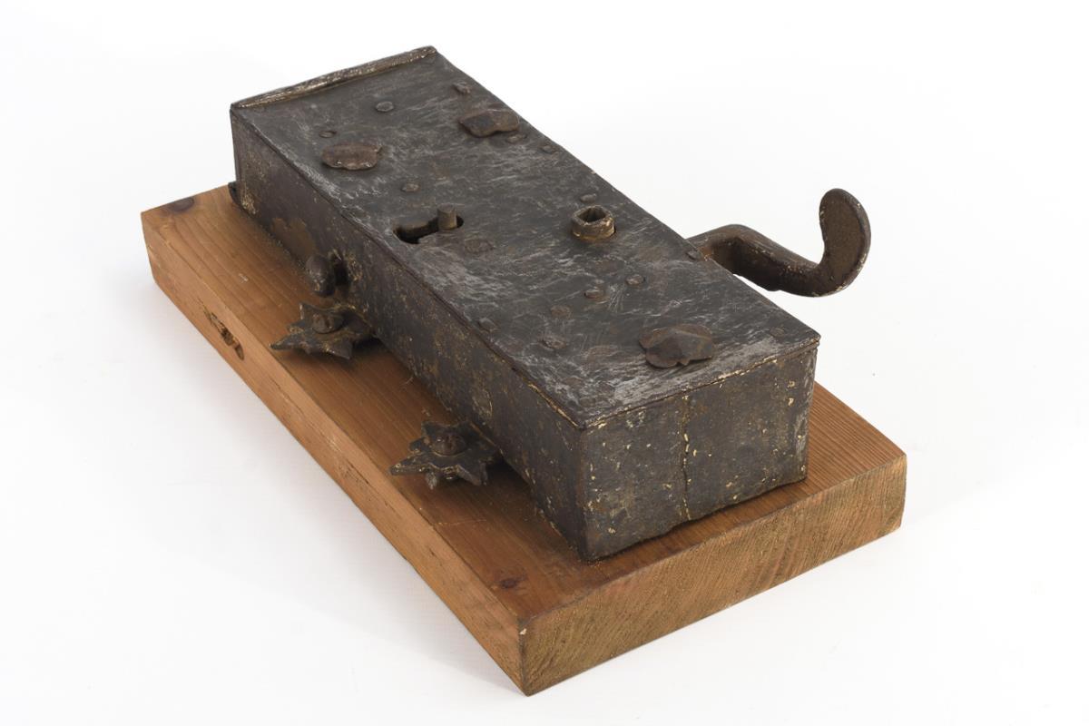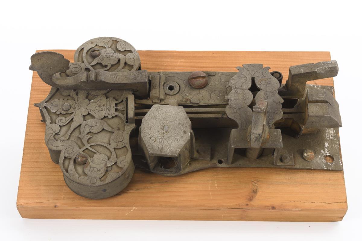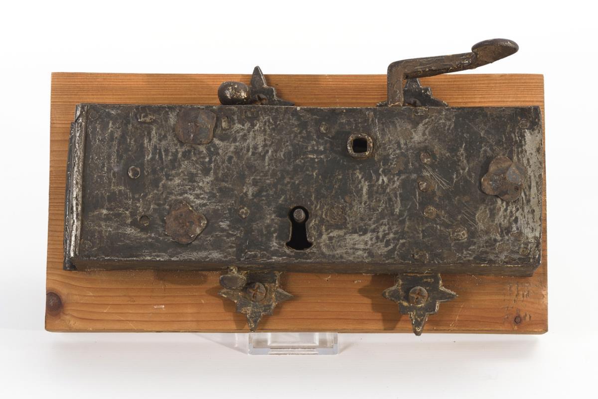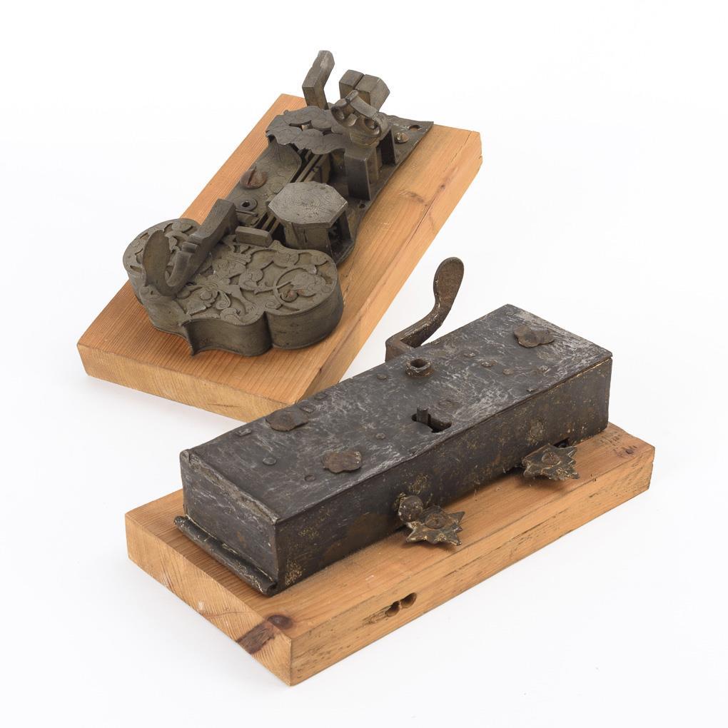Passiges Renaissance-Schloss mit gravierter Arabeske-Aushaue auf der Schlossdecke und Gravur auf der Kapelle usw.. Drücker für die hebende Falle in Kopfform, 2 schießende Schrägfallen sowie Nachtriegel. Intaktes Eingericht (2 Richtscheiben in Sternform). / Überbautes Türschloss mit Wächter; intaktes Eingericht mit Reifen und Richtscheiben. Alters-/Gebrauchsspuren.
