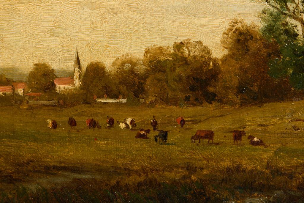 Kleine Landschaft mit den Tieren auf der Weide nahe dem Dorf.