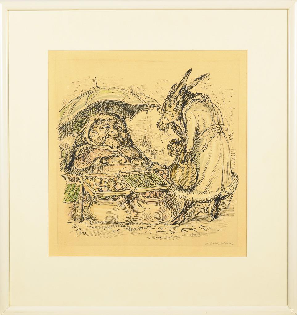 Aquarellierte Tuschzeichnung auf handgetöntem Papier. Bleistiftsignatur. [1975].