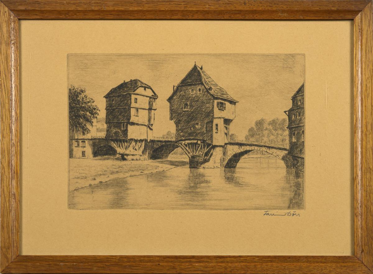 Darstellung der Brückenhäuser auf der Alten Nahebrücke in Bad Kreuznach, verso Klebezettel "Zur Verlobung am 16.11.1947 / Die Mitarbeiter des Katasteramtes Bad Kreuznach.". Blatt stark gebräunt.