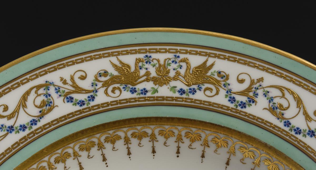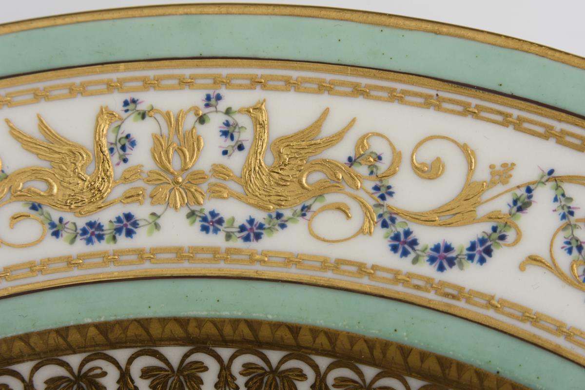 2 fein bemalte Suppenteller. Auf der Fahne mintgrüne Fondbänder, zwischen goldenen Mäanderbändern reliefgoldgemalte Grotesken, umwunden von Kornblumenfestons, in der Kehle ein reliefgoldgemaltes Palmettenband.