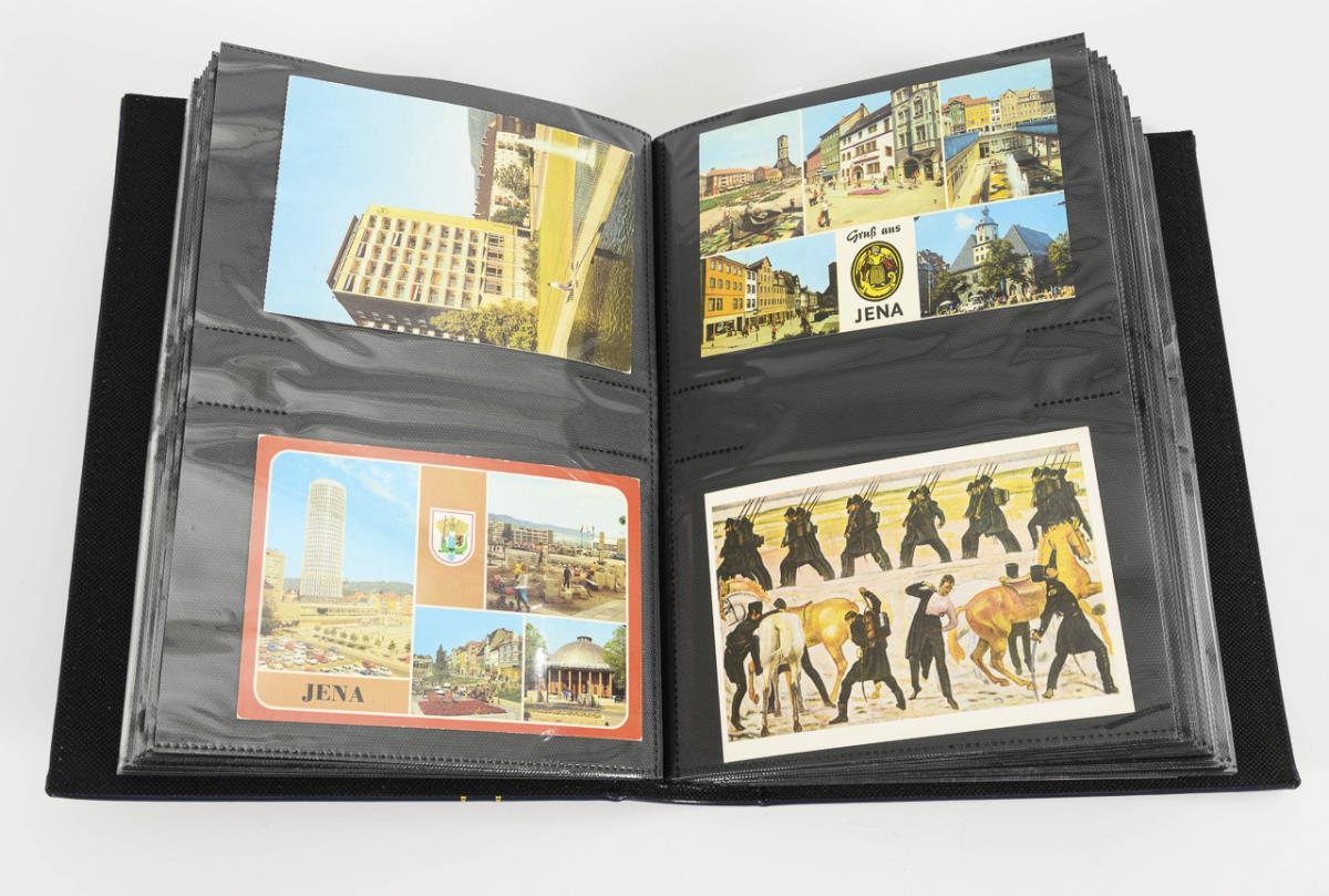 Ca. 300 Ansichtskarten nur Jena. Graues "Post-Karten Album" mit Mohnblüten, 27 x 21 cm und modernes dunkelblaues Album, 29 x 21 cm.