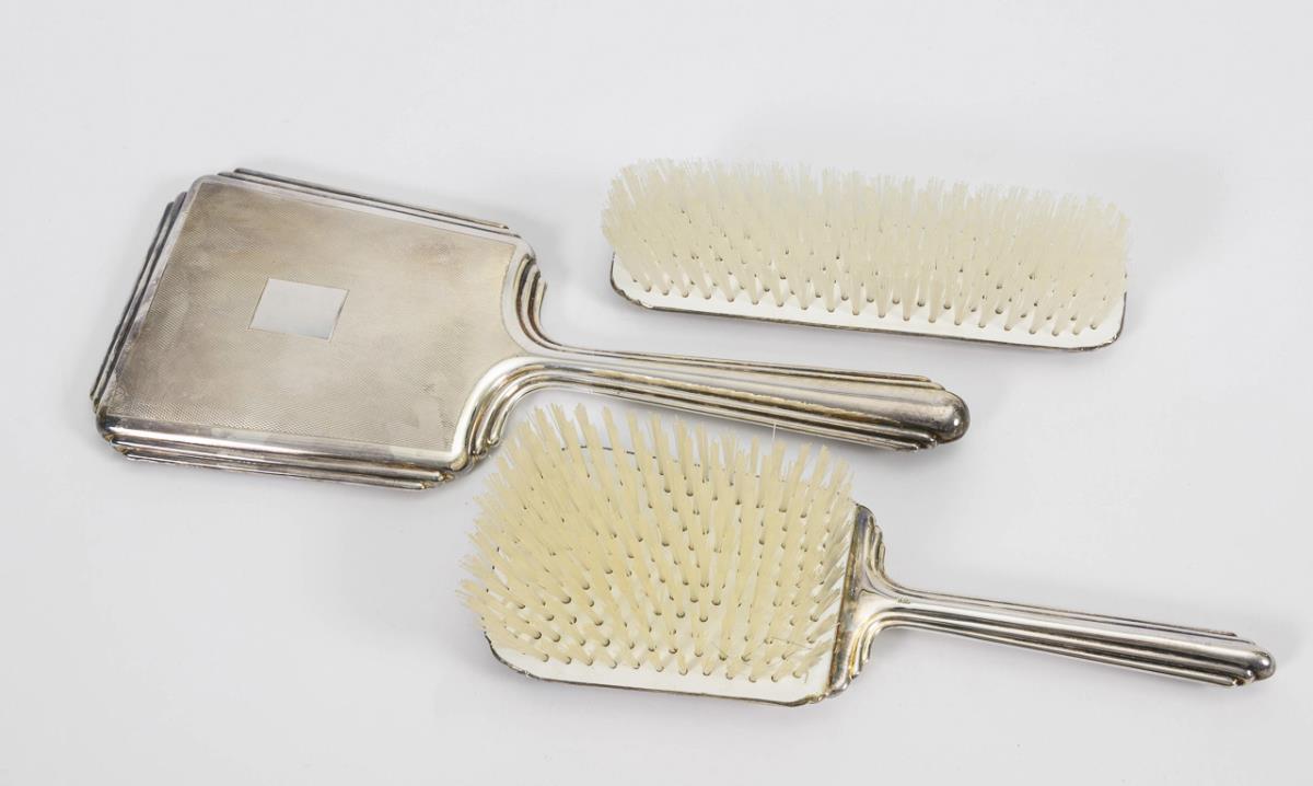 4-teiliges Set mit Spiegel, Kamm und 2 Bürsten. Ergänzte braune Schatulle in Kokoleder-Optik. Minimale Gebrauchsspuren, Spiegel mit kleinen Blindstellen.