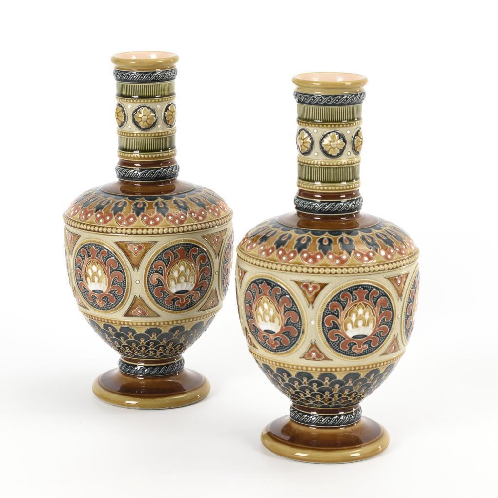 Paar Gründerzeit-Enghalsvasen mit historistischem Reliefdekor. Villeroy & Boch.